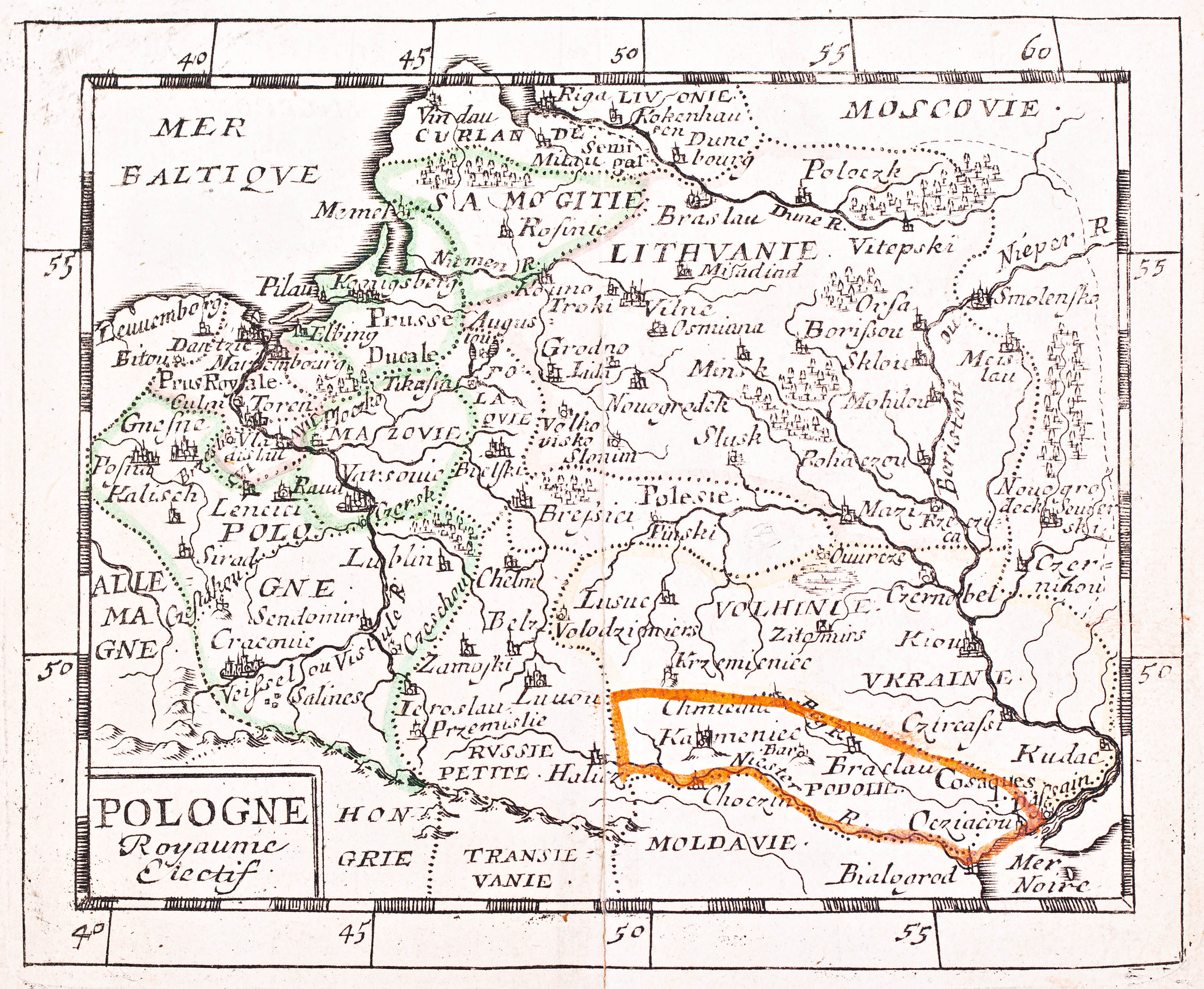 Mapa ziem Rzeczpospolitej pochodząca z „La géographie universelle”, Paryż, 1661miedzioryt, 11 x 13 cm (odcisk płyty)stan zachowania: arkusz podklejony papieremImago Poloniae, K31/1