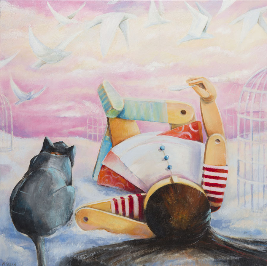 technika własna/płótno, 100 x 100 cmsygnowany l.d.: 'M.STERN'na odwrociu opisany: ' "Polowanie na niespokojne myśli" | Mirella Stern 2016'