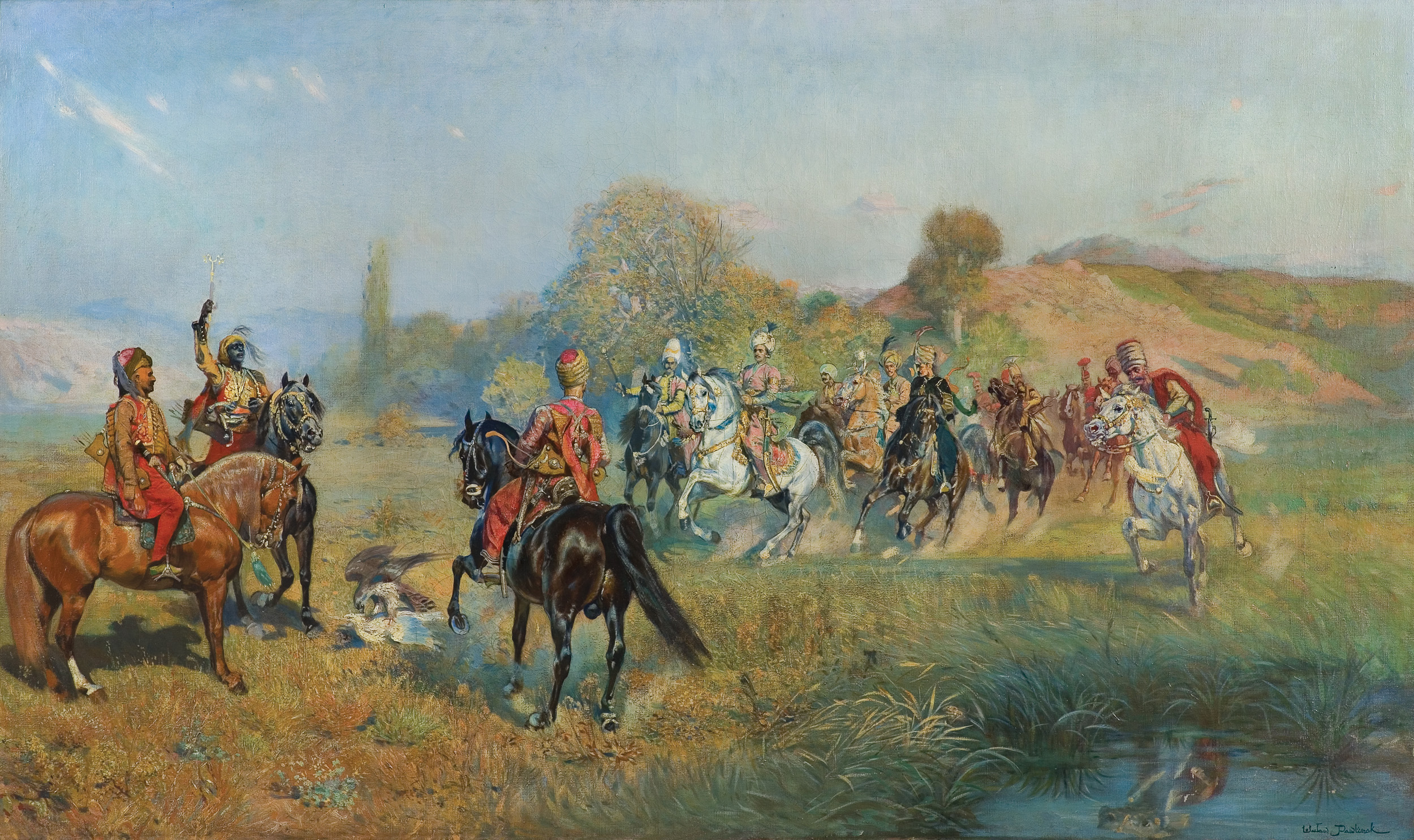 Wacław Pawliszak (Warszawa 1866 - Warszawa 1905) - malarz, rysownik, ilustrator; już jako dziecko wykazywał niezwykłe zdolności do rysunku; wcześnie też rozpoczął naukę - najpierw u Wojciecha Gersona w warszawskiej Klasie Rysunkowej, a w wieku czternastu lat w Szkole Sztuk Pięknych w Krakowie. Studiował pod kierunkiem Władysława Łuszczkiewicza i Floriana Cynka, był ulubionym uczniem Jana Matejki. Następnie uczył się jeszcze w Monachium u Józefa Brandta (1885) i w Paryżu u A. E. Carolusa-Duran (1886). Stale mieszkał w Warszawie, ale wiele podróżował; był w Rzymie, a przede wszystkim jeździł na Wschód, w którym „rozmiłował się do fanatyzmu„. Podróżował do Algieru, Tunisu, Maroka, Albanii, Dalmacji, Egiptu, Iranu i Iraku, jeździł na Krym i do Konstantynopola, wszędzie znajdując tematy do swych obrazów i z pasją kolekcjonera skupując wschodnie tkaniny i broń. Malował portrety, pejzaże i popularne wówczas „sceny rokokowe„, ale przede wszystkim obrazy historyczne i batalistyczne z dziejów XVII-wiecznych wojen polskich. Wiele wystawiał, tak w kraju jak i za granicą; m.in. w 1889 w Paryżu (brązowy medal za obraz Emir Rzewuski na Wystawie Powszechnej), w 1894 w Chicago i San Francisco, w 1898 w Petersburgu, w 1900 w Paryżu (list pochwalny za Strzelanie do orłów na Wystawie Światowej). Pracował nad Pocztem królów polskich, ilustrował czasopisma i książki, m.in. Pana Tadeusza, Beniowskiego i wiedeńskie wydanie Baśni tysiąca i jednej nocy. Zginął tragicznie, śmiertelnie postrzelony przez Xawerego Dunikowskiego. W polskich zbiorach muzealnych obrazów artysty jest niewiele; większa ich liczba znajduje się w kolekcjach prywatnych.