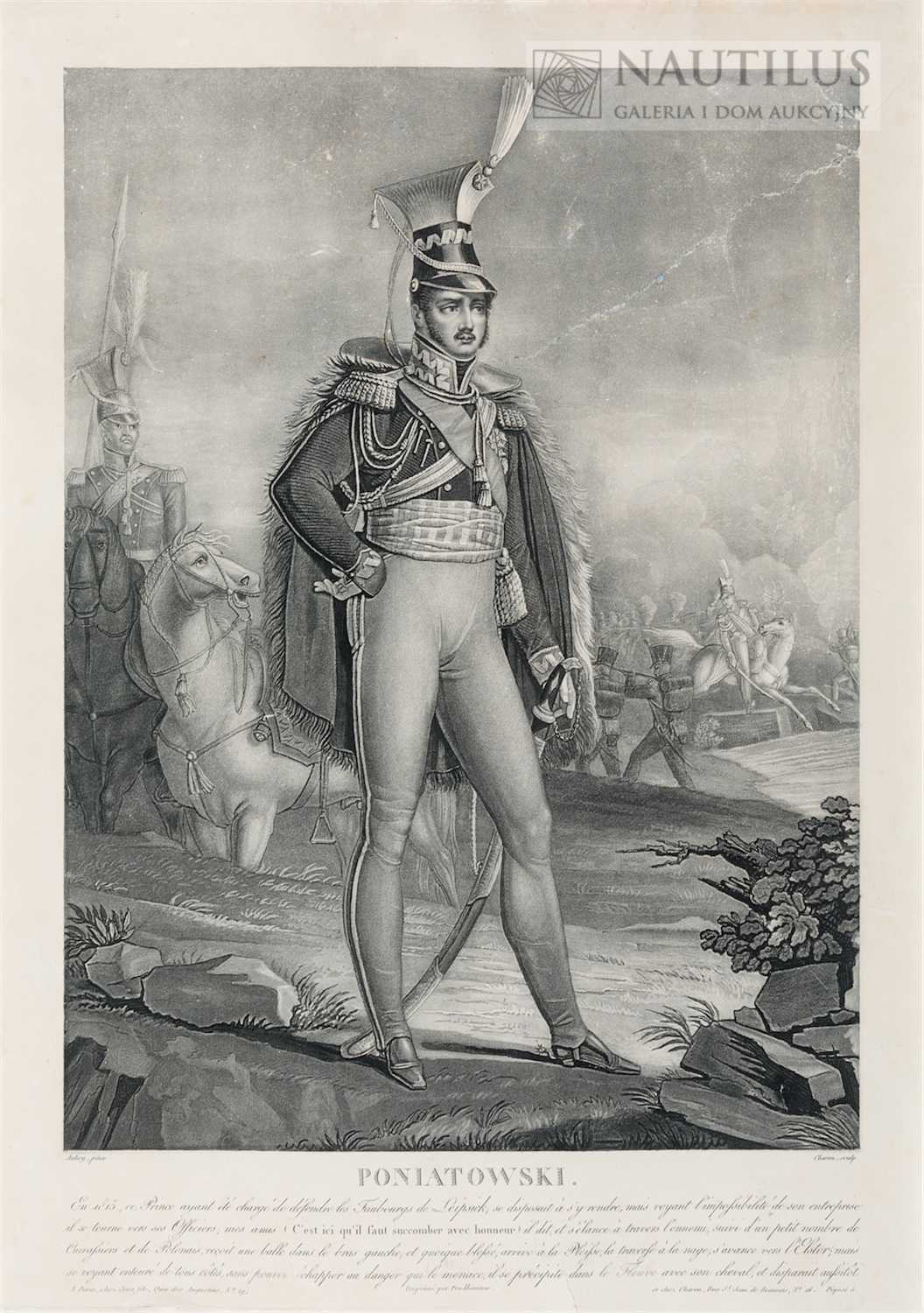 Akwatinta, papier; wym.: 400 x 290 mm; plansza: 490 x 360 mm; sygn. pł. l.d: Aubry pinx, p.d.: Charon sculp. Pod kompozycją nazwi- sko Poniatowski, nota informacyjna w języku francuskim oraz noty edytorskie. Wyd. Prudhomme, Paris. Książę Józef stojący na tle sceny ukazującej jego skok do Elstery. Grafika z serii sztychów przedsta- wiających marszałków Francji. Praca po konserwacji. Lit.: Katalog portretów… BN nie notuje.