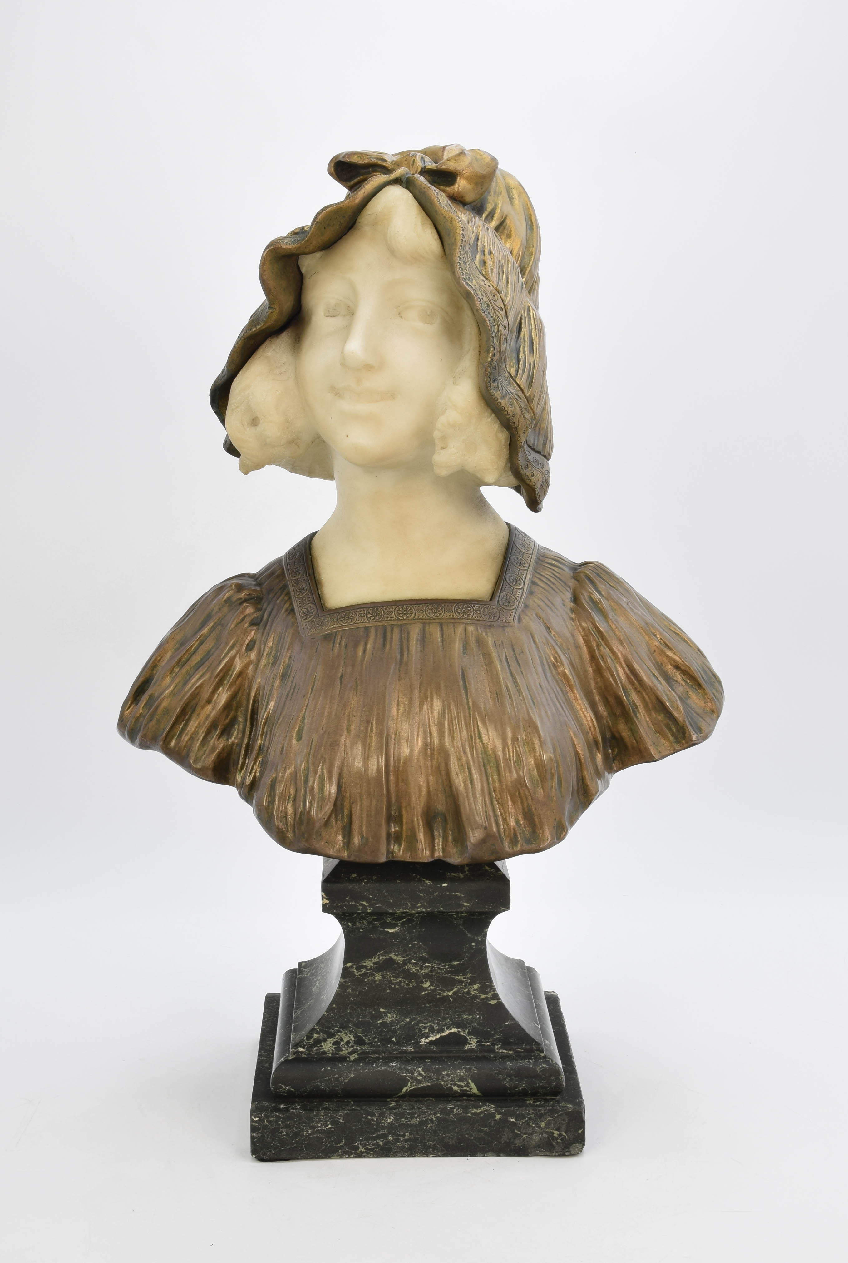 Portret uśmiechniętej dziewczyny w czepku o falbankowym otoku z kokardą i sukni z kwadratowym dekoltem z lamówką, w dalszej części fantazyjnie udrapowanej, na marmurowej podstawie w formie części tralki zwężającej się ku torsowi przedstawionej postaci.