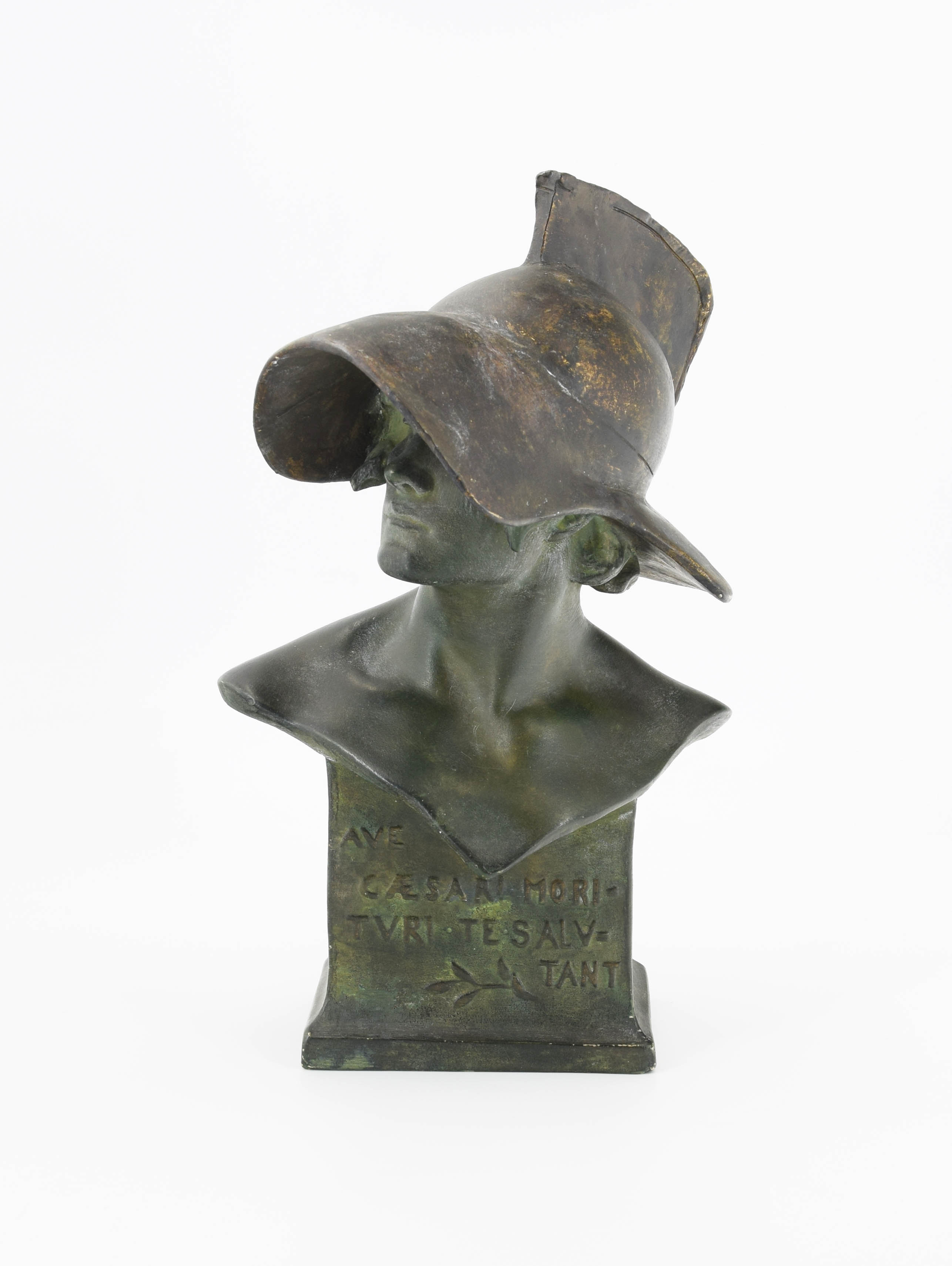 Na prostokątnej podstawie z listwową opaską u dołu popiersie gladiatora en trois quarts, w hełmie ; od frontu podstawy napis: AVE/ CAESAR! MORI=/ TVRI • TE SALV=/TANT i gałązka oliwna (z prawej); (witaj Cesarzu! Idący na śmierć pozdrawiają Cię).