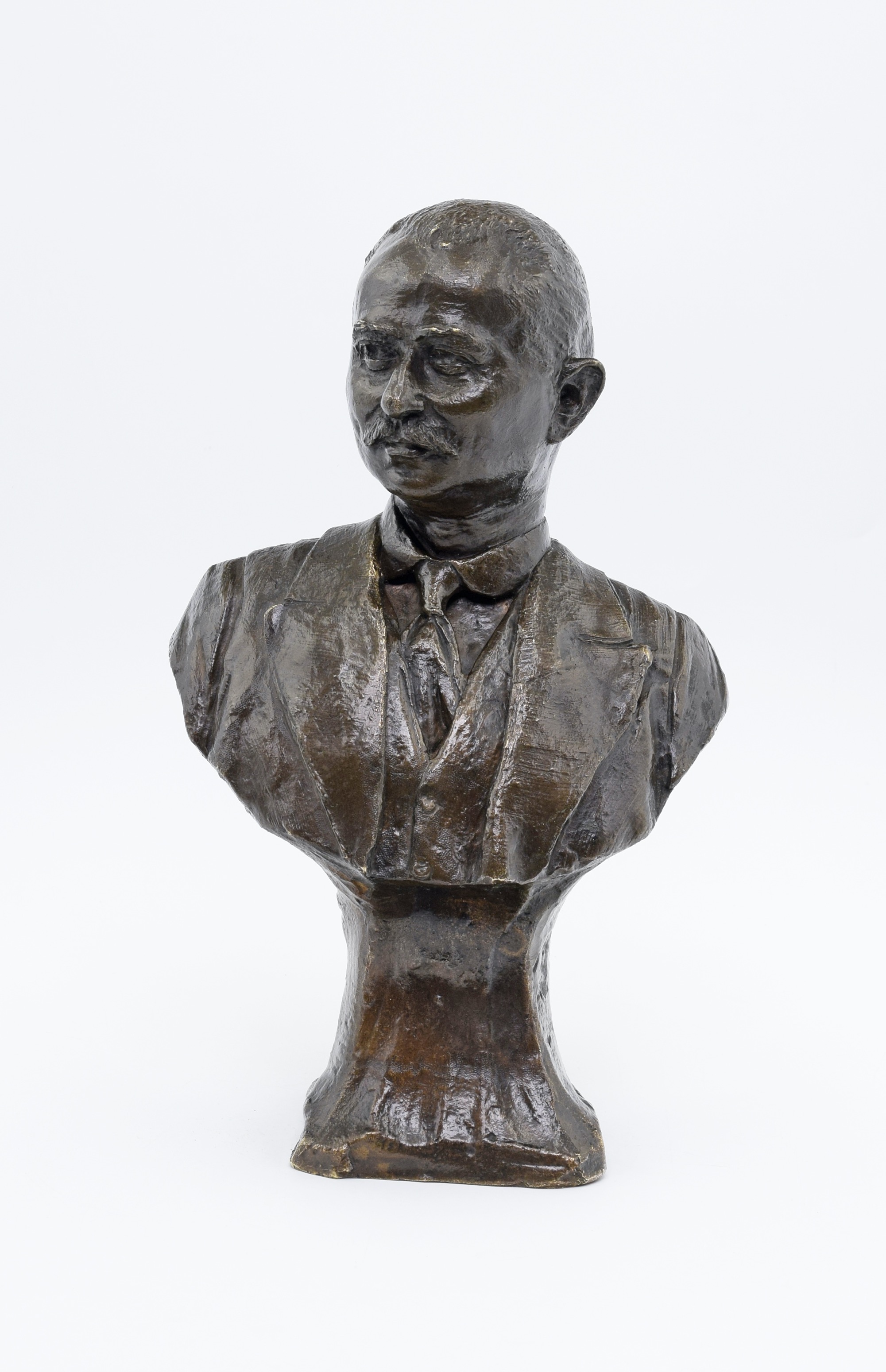 Portretowe popiersie mężczyzny z wąsami, w kamizelce i marynarce.