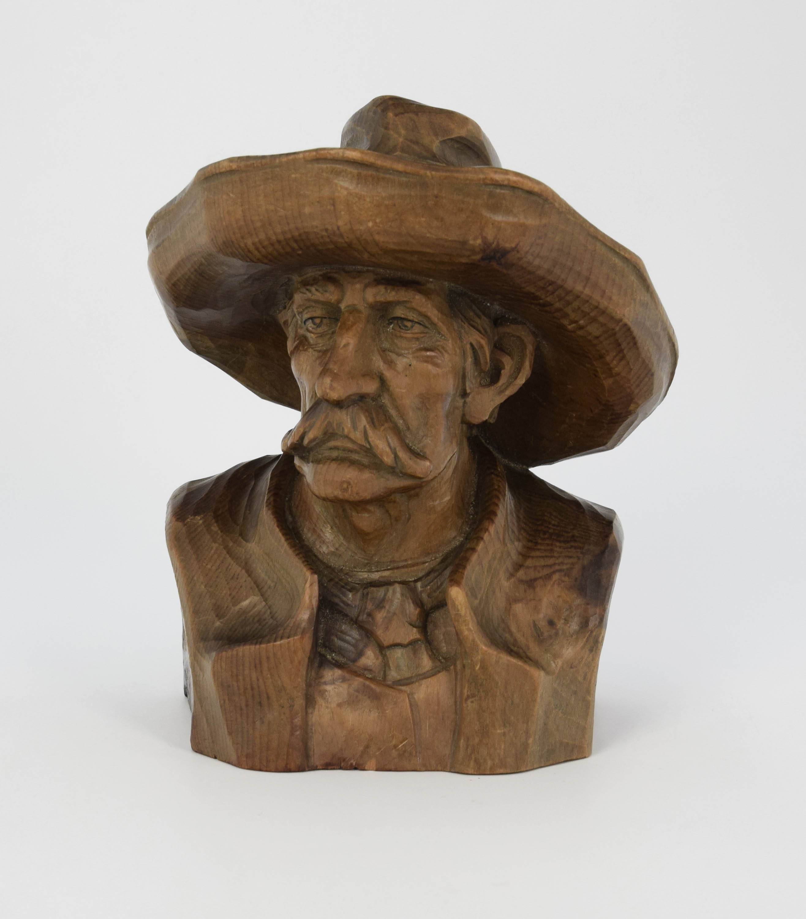 Portretowe popiersie mężczyzny z obfitymi wąsami i wyrazistymi rysami, w kapeluszu o szerokim, wywiniętym rondzie. Na spodzie - napisy atramentowym ołówkiem: „875” / „LK”.