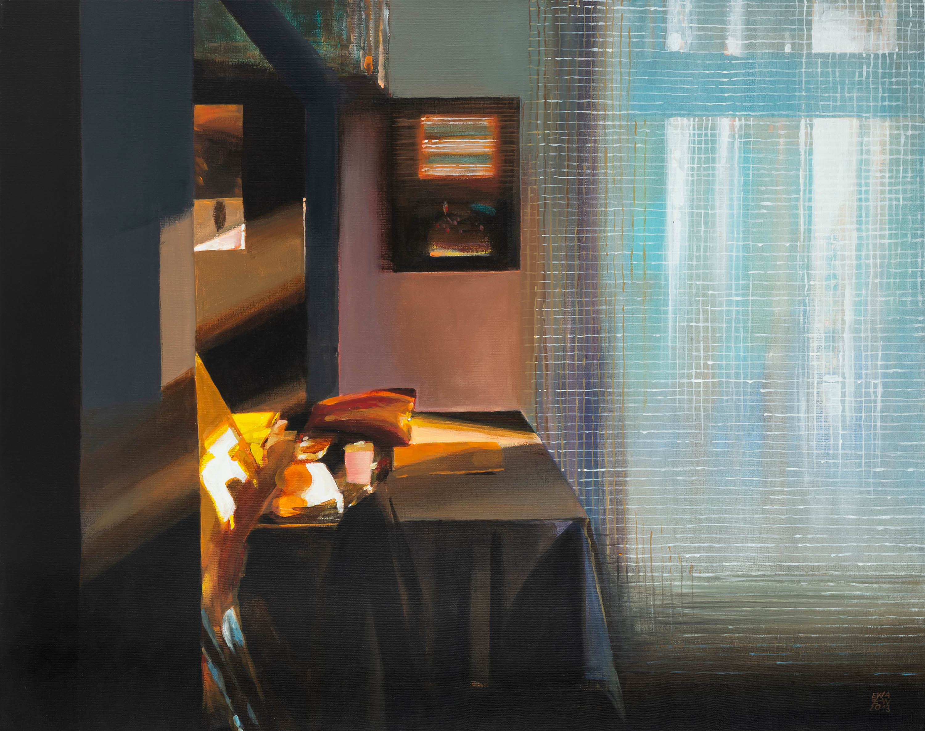 olej, płótno, 73 x 92 cm,sygn., opisany i dat. na odwrocie: EWA ŻELEWSKA-WSIOŁKOWSKA / POPOŁUDNIE W PRACOWNI / AKRYL / 2012/2013 / 73 x 92