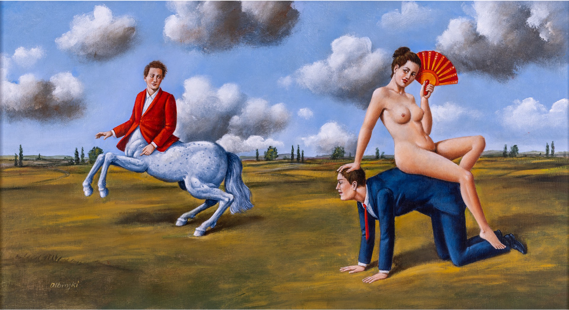 olej, akryl, płótno, 45 x 80 cm (w oprawie 66 x 101 cm), sygnowany l.d.: 'Olbiński' oraz opisany na odwrocie: 'First Painting | of 2022 "Poranna przejażdzka" | Martinique, Jan. 2022 | Olbiński'