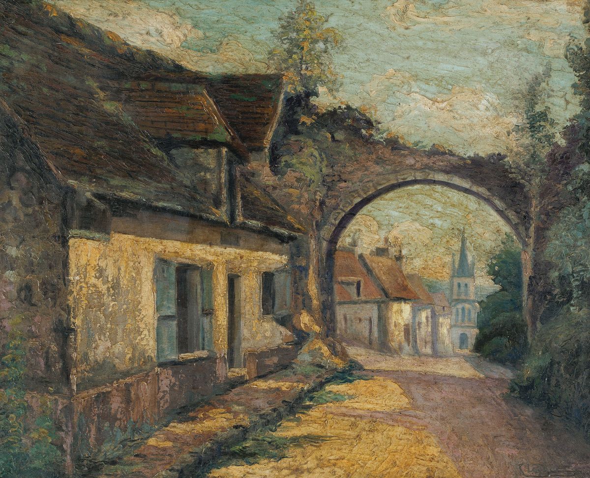 Olej, sklejka; 53 x 62,5 cmSygnowany p.d.: R LacazeNa odwrocie: Montfort-Lamaury / Port Bardou / -S.O. / R Lacaze