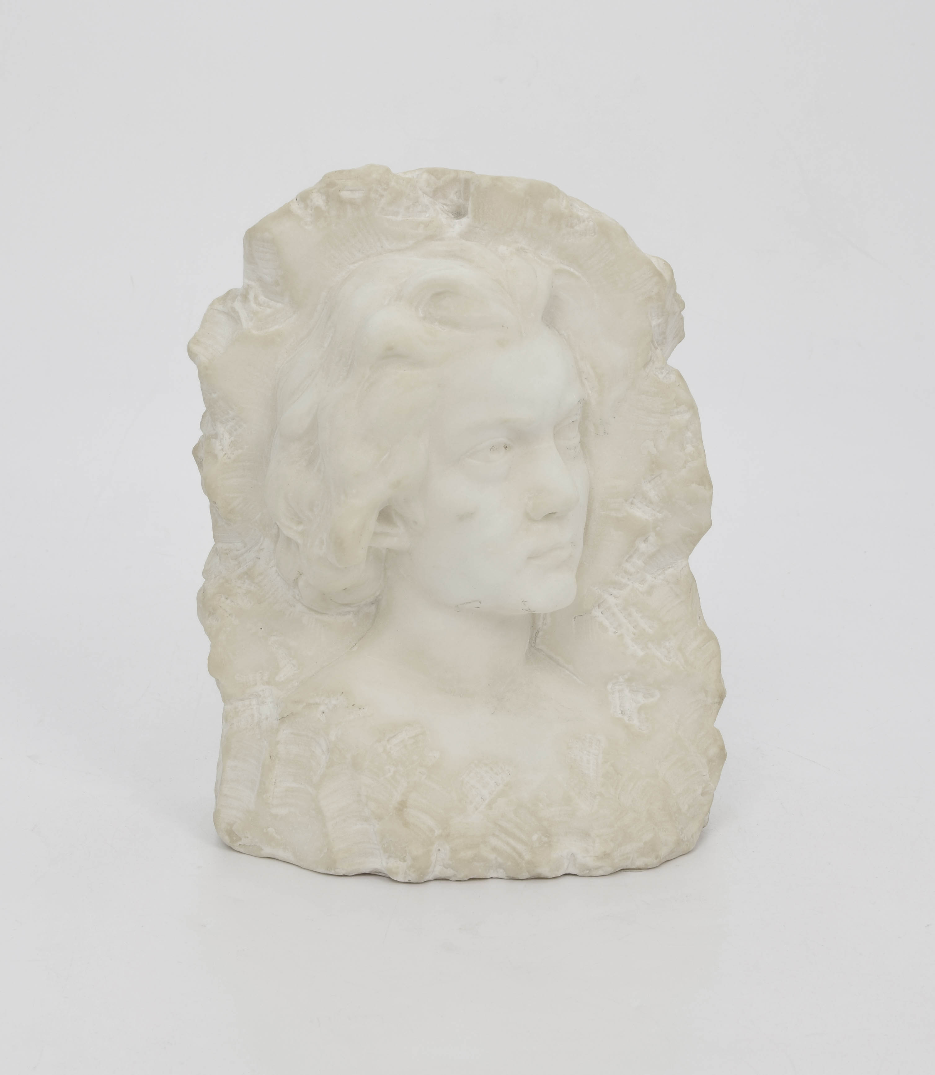 Twarz o delikatnych rysach, okolona lekko wijącymi się włosami, wydobyta z nieobrobionej bryły alabastru.