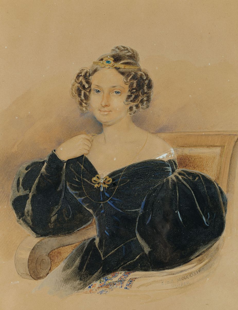Ołówek, akwarela, gwasz, tempera, złota farba, papier; 28 x 22 cm (w świetle ramy)Sygnowany p.d.: Roma MCCCXXXIV / ReichanNa odwrocie: Gräfin von Bubre aus Polen