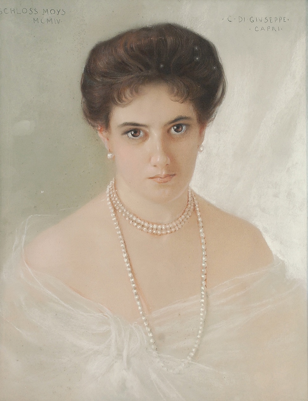 pastel, papier naklejony na tekturę; 53 x 41 cm; sygn. i dat. p. g.: C DI GIVSEPPE / CAPRI ; l. g.: SCHLOSS MOYS / MCMIV; na odwrocie nieczytelna informacja o osobie portretowanej. Obraz przed konserwacją.