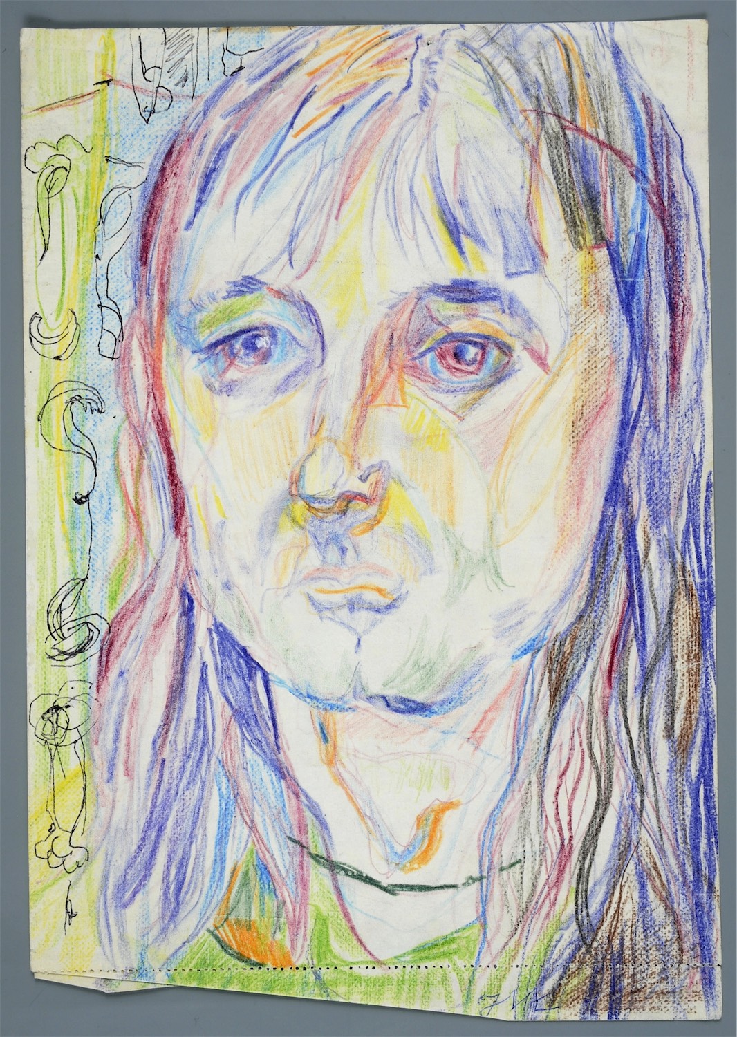 kredki, długopis czarny; papier – kartka ze skoroszytu (perforowany u dołu); 30 x 20,5 cm;