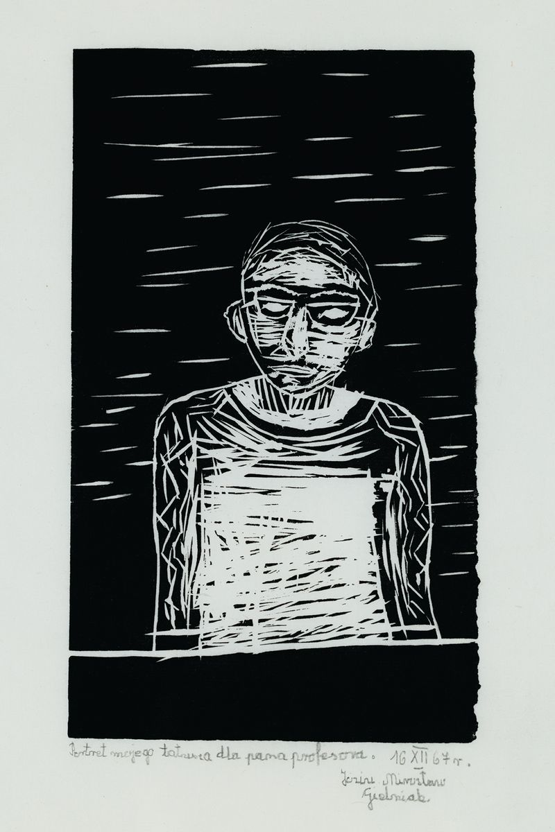 Linoryt, papier; 21,5 x 14,5 cm (w świetle p-p)Sygnowany ołówkiem pod rycina: Portret mojego tatusia dla pana profesora, 16 XII 67 r. / Józini Mirosław / Gielniak