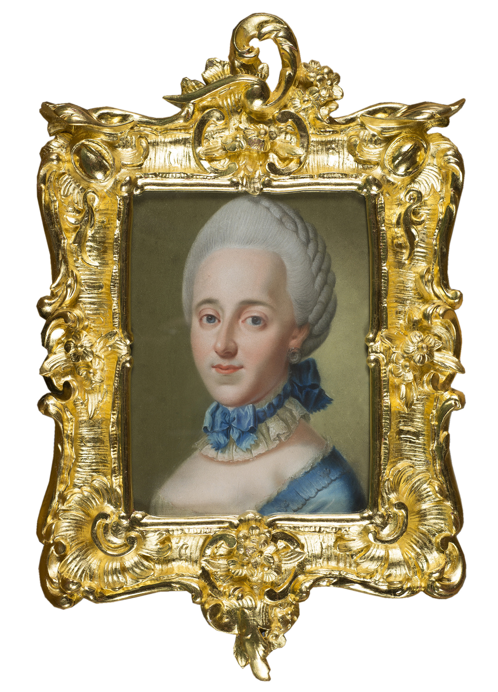 Kobieta ubrana jest w błękitną suknię rob a'la francaise, jej szyję zdobi kolareta, włosy mocno upudrowane, zaczesane według ówczesnej mody.