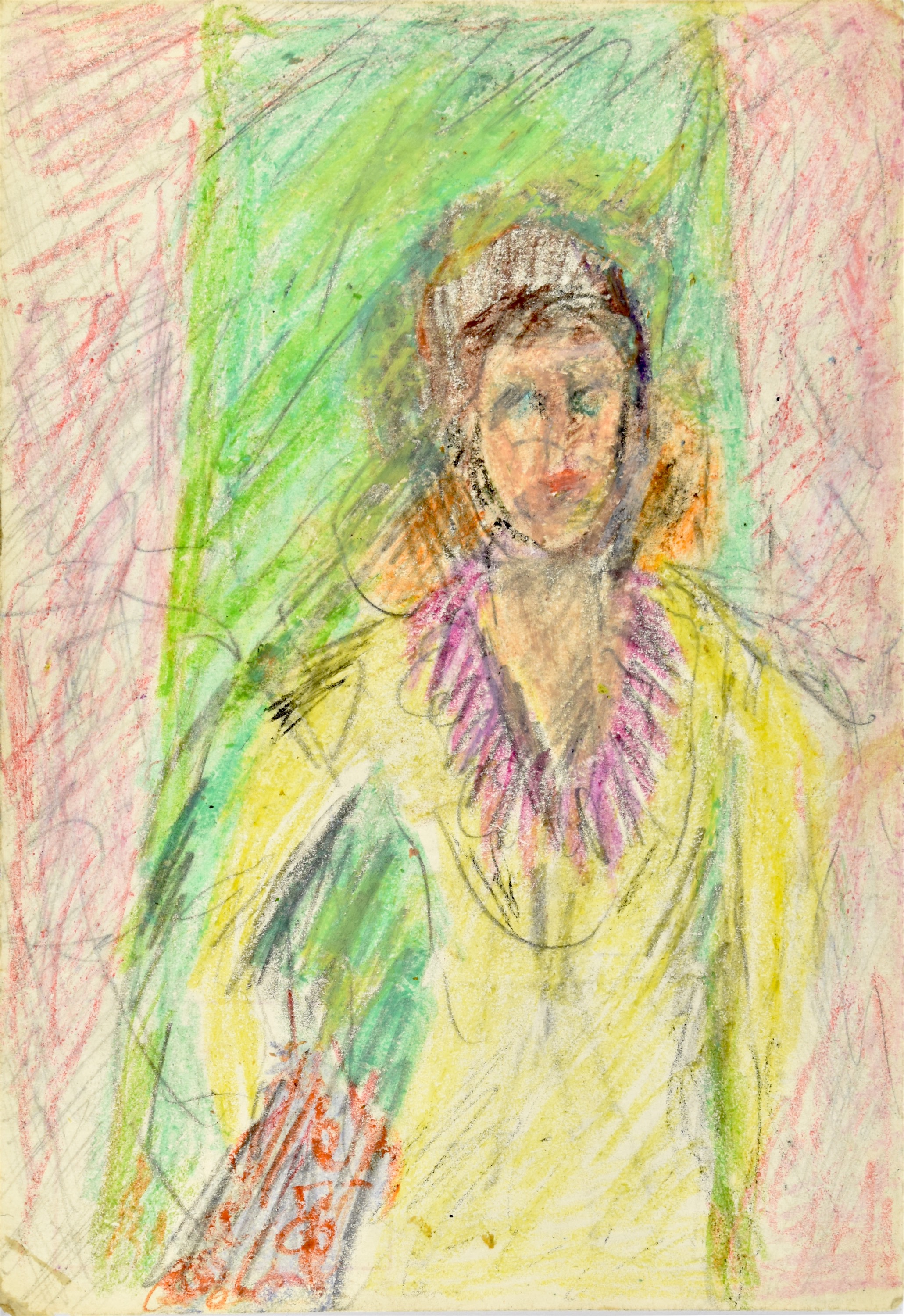 kredka, ołówek, papier; 20,5 x 14,2 cm;na odwrocie pieczęć: Krystyna PELLETIER / Obiekt Nr …../ ZE SPUŚCIZNY POŚMIERTNEJ / A. i P. Pelletierowie;na odwrocie szkic postaci (ołówkiem).