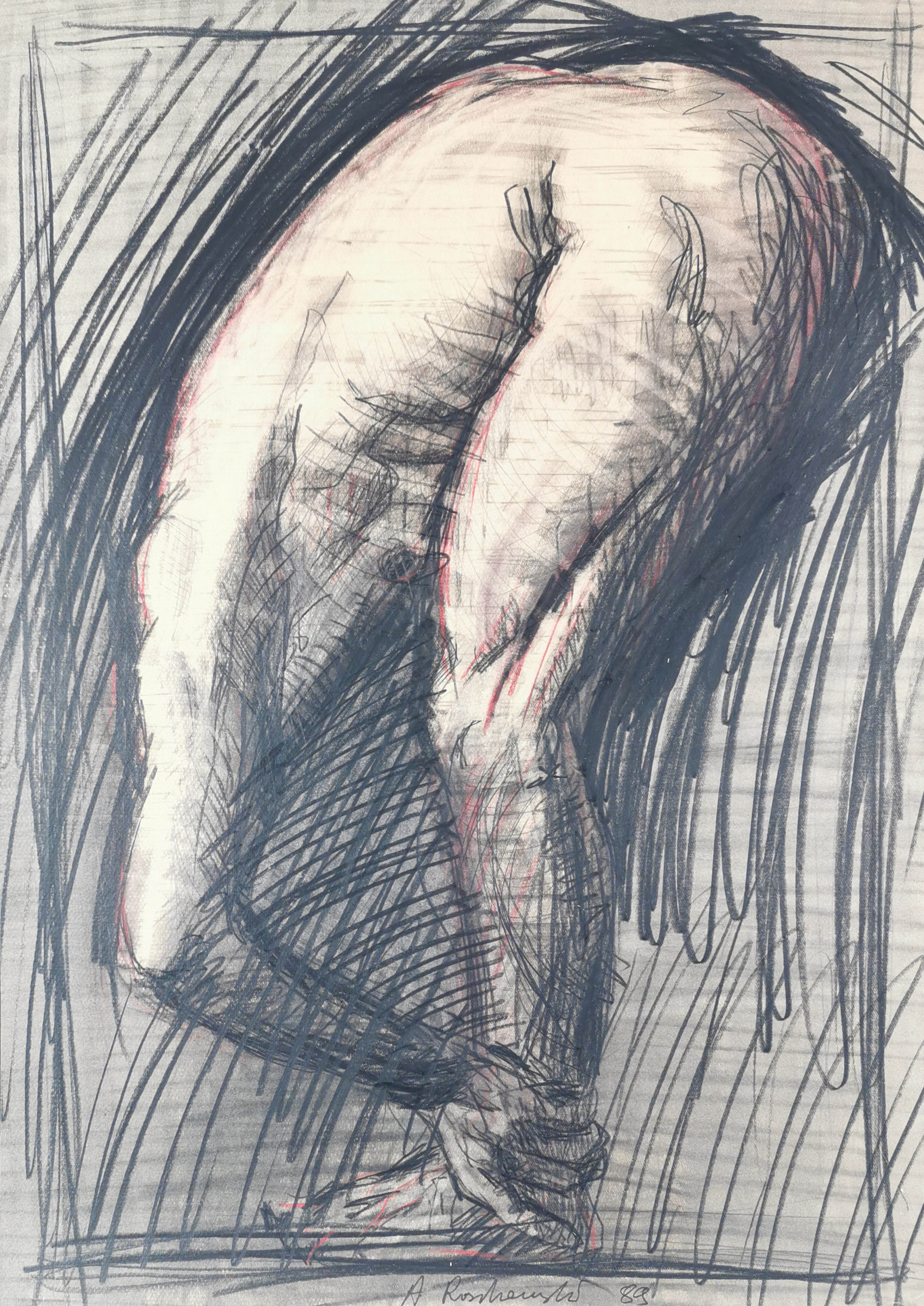 kredka, węgiel, ołówek, karton; 70 x 50 cm; sygn. i dat. śr. d.: A.Roszkowski 89;opis autorski na odwrocie: ALEKSANDER ROSZKOWSKI / "POSTAĆ SCHYLONA" VII 1989