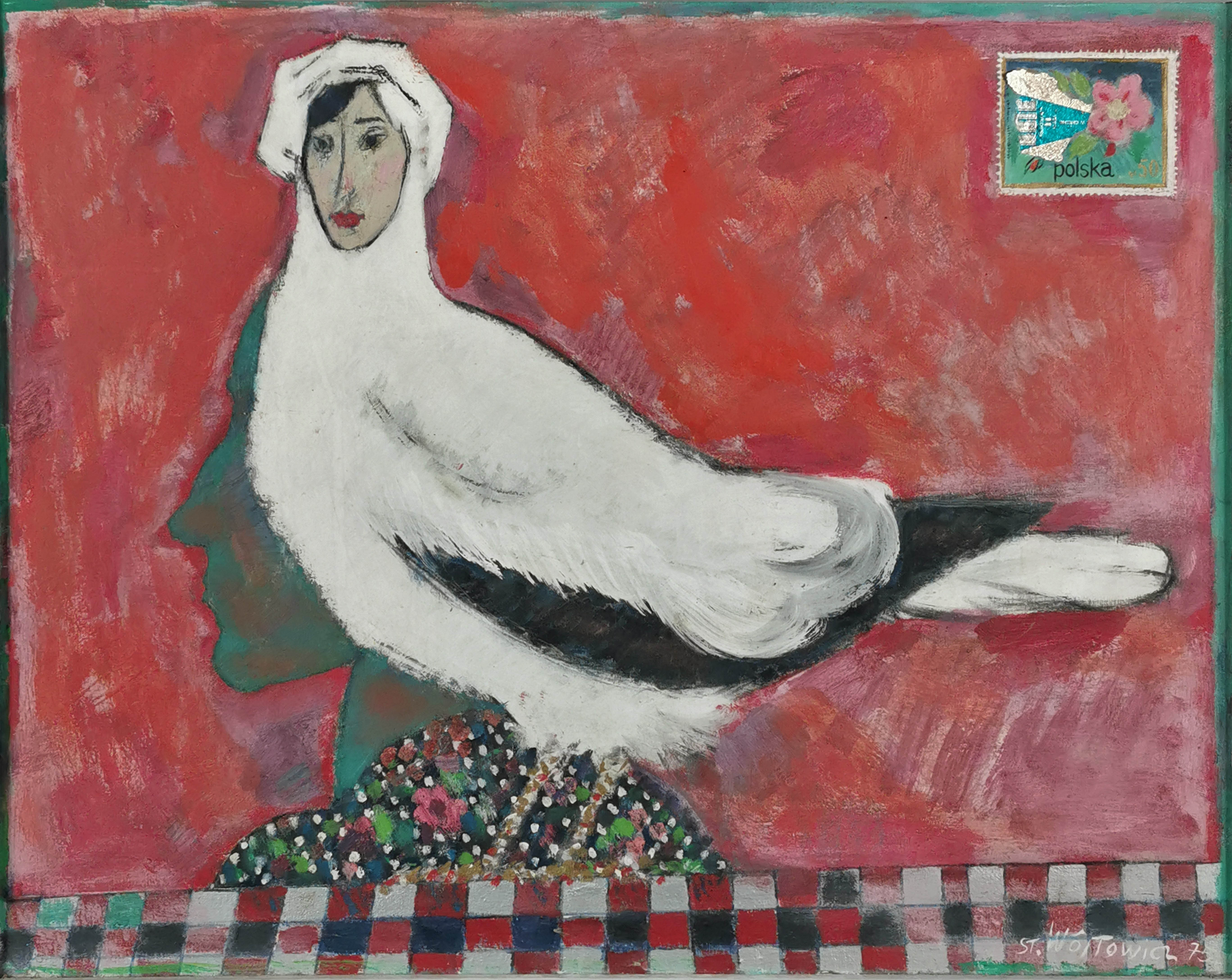 opisany na odwrocie: STANISŁAW WOJTOWICZ / KRAKÓW; oraz papierowa nalepka z CBWA Kraków z informacją o autorze i obrazie, z tytułem: POŚWIĘCAM TOBIE i PRZESYŁAM / WRAZ Z CAŁUSAMI MOJA / GOŁĄBECZKO (nalepka wypełniona odręcznie, długopisem).