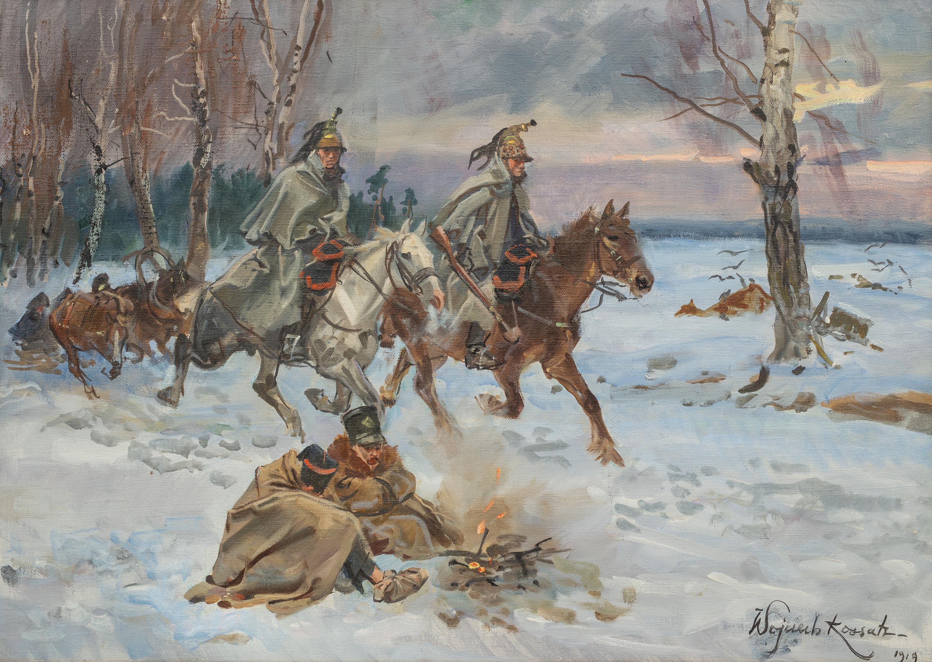 Prezentowany na aukcji obraz Wojciecha Kossaka wpisuje się w krąg tematyczny epopei napoleońskiej, znany z panoram i innych dzieł, gdzie kompozycja sceny ukazuje jedną z wersji odwrotu Napoleona spod Moskwy. Do innych znanych malowideł z serii wojen napoleońskich należą m.in.: „Powrót Napoleona z Rosji” z 1904 r. (il.1) czy „Napoleon w odwrocie spod Moskwy z 1925 r. (il.2). Obrazy o tej tematyce datowane są na koniec lat 20. XX wieku. (S. Krzysztofowicz-Kozakowska,„Kossakowie, Wrocław 2005, s. 138) Wojciech Kossak malował obrazy o problematyce wojen napoleońskich przede wszystkim dlatego, że był zafascynowany tradycyjnym malarstwem historyczno-batalistycznym, a także z powodu patriotycznego kontekstu tych tematów. Kwestie związane z Napoleonem były ważne w świadomości Polaków i funkcjonowały jako symbol utraconej szansy na odzyskanie niepodległości, co nadawało tym obrazom silny wydźwięk patriotyczny. Podobnie jak wielu innych polskich artystów, Wojciech Kossak w swoich wyobrażeniach idealizował postać Napoleona oraz wzmacniał jego legendę, przedstawiając zarówno walki, które stoczył, jak i doznane klęski oraz dramatyczne odwroty. Wojciech Kossak miał konsekwentny programy artystyczny, który towarzyszył mu do końca życia. Malarz systematycznie powracał do tych samych sprawdzonych tematów, które mógł podporządkować zasadzie realistycznego interpretowania postaci, detali kostiumologicznych oraz natury. Jego zdolności do wnikliwej obserwacji i znakomitej pamięci wyrażone były w wiernym i sugestywnym przedstawieniu wydarzeń, gdzie także przejawiała się „(…) umiejętność znakomitego ujmowania sylwet, zwłaszcza koni, nawet przy stosowaniu trudnych skrotów i skomplikowanych ujęć perspektywicznych (…)” (S.Krzysztofowicz-Kozakowska, „Kossakowie, Wrocław 2005, s. 134) tekst oprac. na podst. K. Olszański, „Wojciech Kossak, Zakł.Ossolińskich, Wrocław 1982, S. Krzysztofowicz, Kossakowie (j.w); S.Krzysztofowicz-Kozakowska, „Kossakowie. The Kossaks”, PGS Sopot 2016