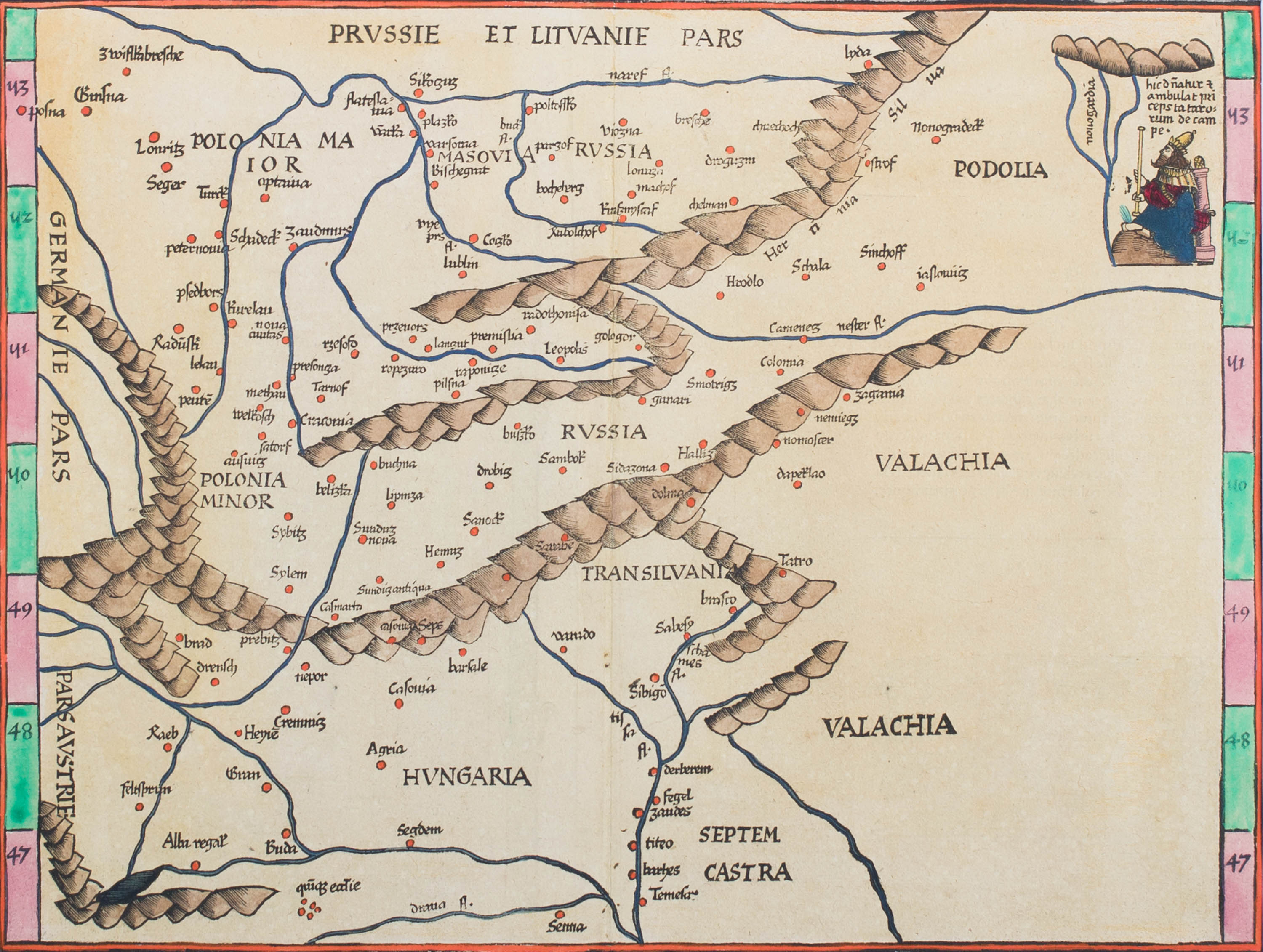 Mapa Europy Środkowej (Polski, Rosji, Węgier, Transylwanii), pochodząca z dzieła Klaudiusza Ptolemeusza „Geographia”, wyd. Johannes Grüninger, Strasburg, 1525 drzeworyt kolorowany, 27,5 x 36,5 cm w świetle oprawy