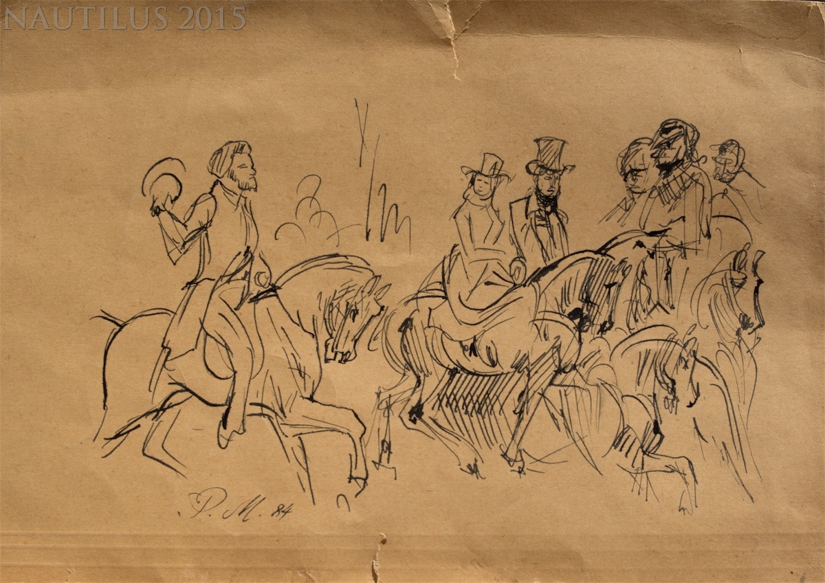 Tusz, karton; wym.: 21 x 30 cm; sygn. tusz l.d.: PM 84. Z lewej prawdopodobnie: A. Mickiewicz. Praca przedarta z góry i dołu po 2 cm.