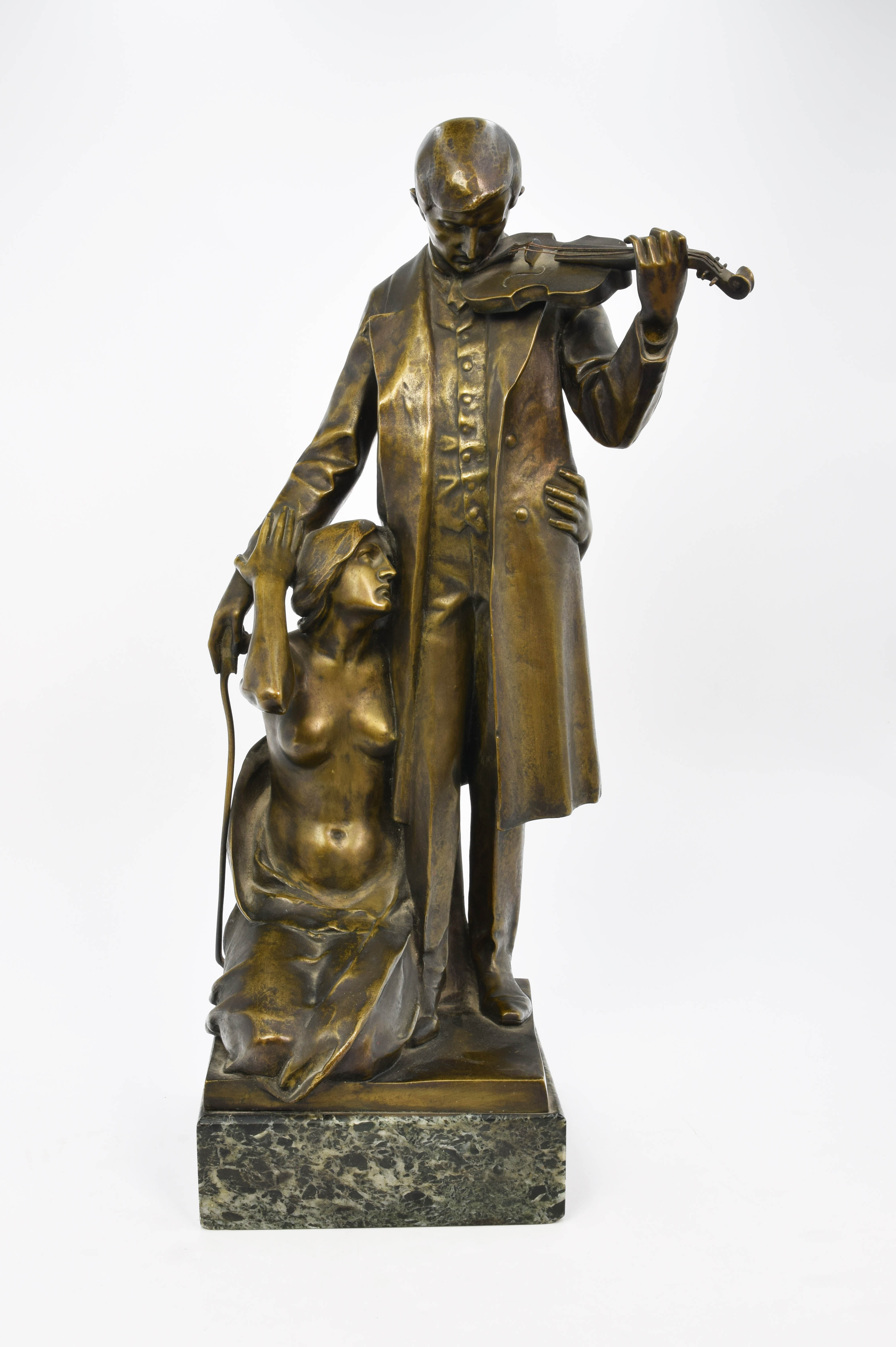 Figura mężczyzny w długim surducie, przygotowującego się do koncertu, stojącego ze skrzypcami pod brodą; prawa ręka ze smyczkiem opuszczona wzdłuż boku; obok tuląca się do niego klęcząca naga postać kobieca. Z tyłu na podstawie ślady sygnatury?. Podstawa kwadratowa, z zielonego marmuru w czarne żyłkowania.