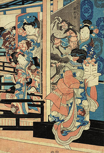 Scena przedstawia kobiety krzątające się przy świątecznych przygotowaniach. Dekoracja na wnoszonym przez kobietę stoliku może świadczyć, że plansza, będąca fragmentem większej całości (prawdopodobnie tryptyku) związana jest ze Świętem Chryzantem obchodzonym dziewiątego dnia dziewiątego miesiąca każdego roku.