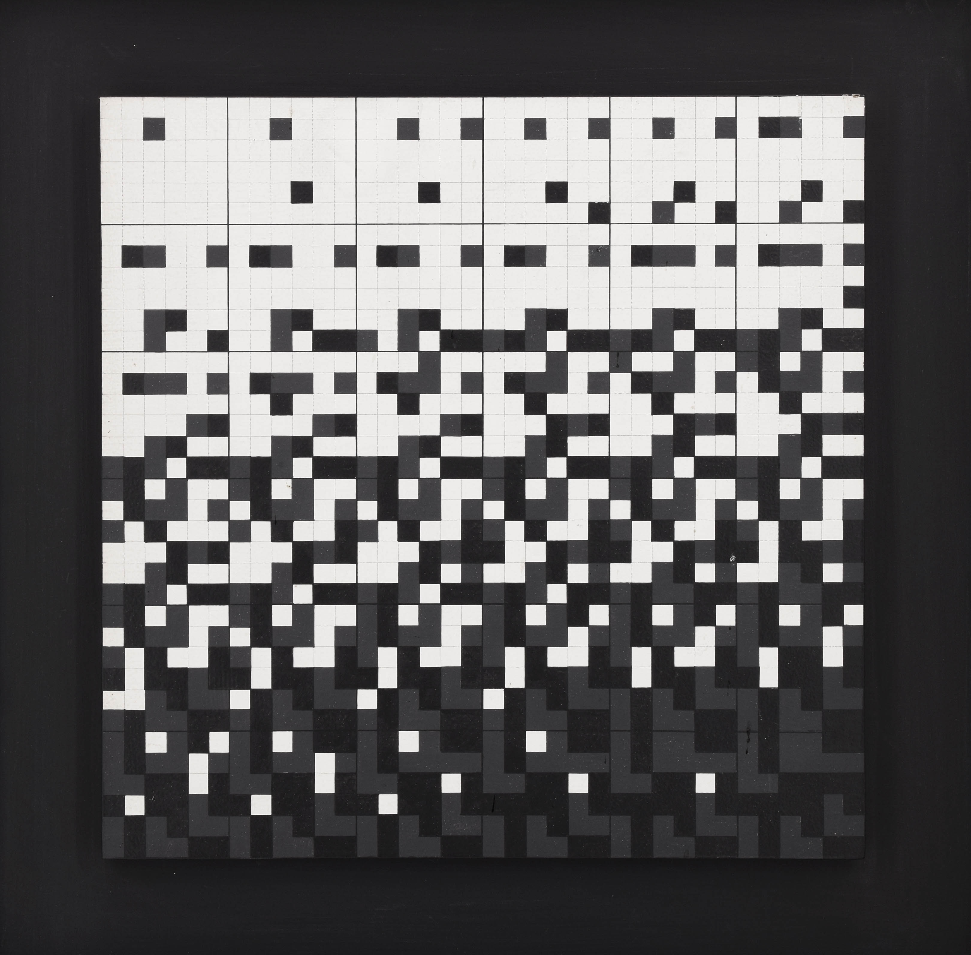 akryl, ołówek, płyta pilśniowa; 49,5 x 49,5 cm (wymiar całości kompozycji w oprawie);sygn. dat. i opisany na odwrocie: Przypadek / w grze 6 x 6 / dla dwóch / winiarski 1984 (flamastrem)