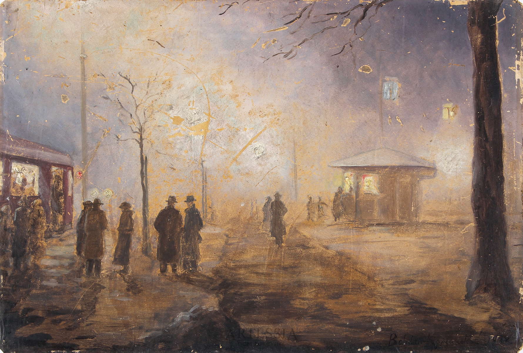 sygn. p. d.: Bohdan Korewicki 1937, na odwrociu na oprawie nalepka TZSP „Zachęta”: Korewicki B. 39887 / przystanek / wykonanie ol. / cena 300 zł. Data 3 MARZ. 1937; napis ołówkiem: Bohdan Korewicki/ „Przystanek” stan zachowania: do konserwacji