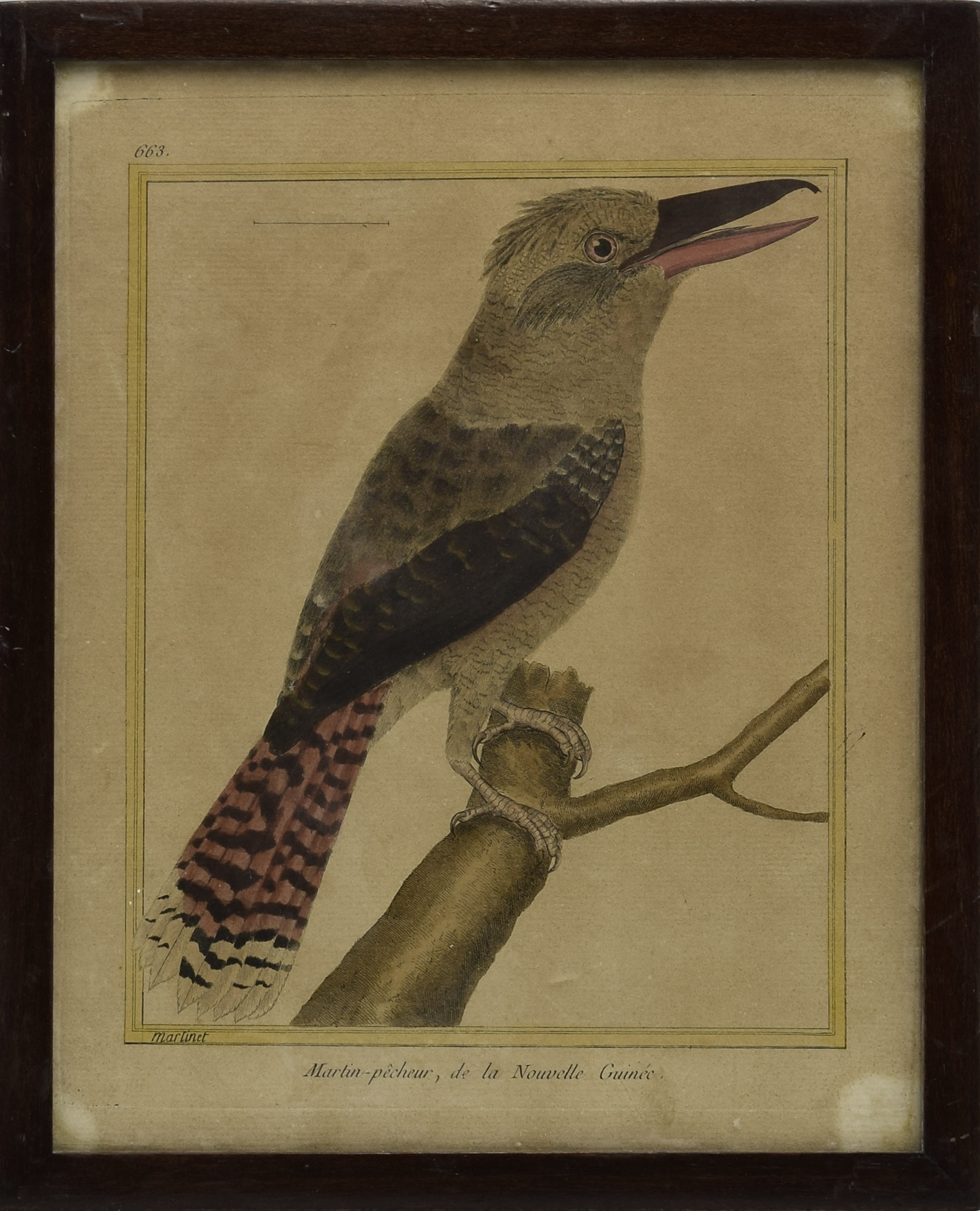 miedzioryt podmalowany akwarelą, papier; 28 x 22,7 cm;sygn. l. d.: Martinetpraca opisana u dołu: Marlin-pecheur, de la Nouvelle Guinée., u góry z lewej: 663.