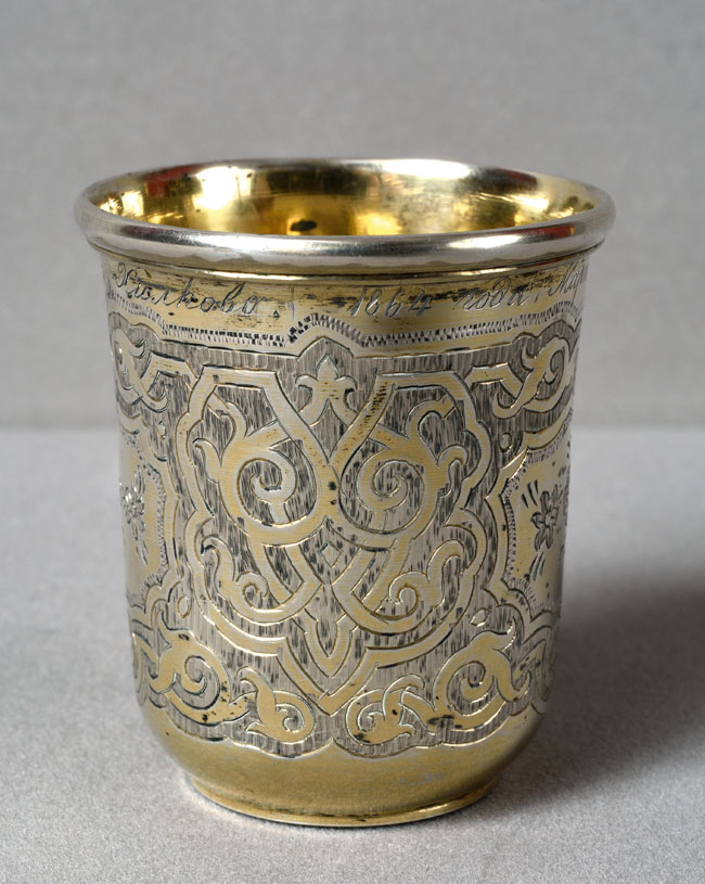 srebro pr. 84, złotnik I. Awdiejew (czynny w latach 1852-1862), cechowany na spodzie; wysokość 6 cm, średnica 5 cm.