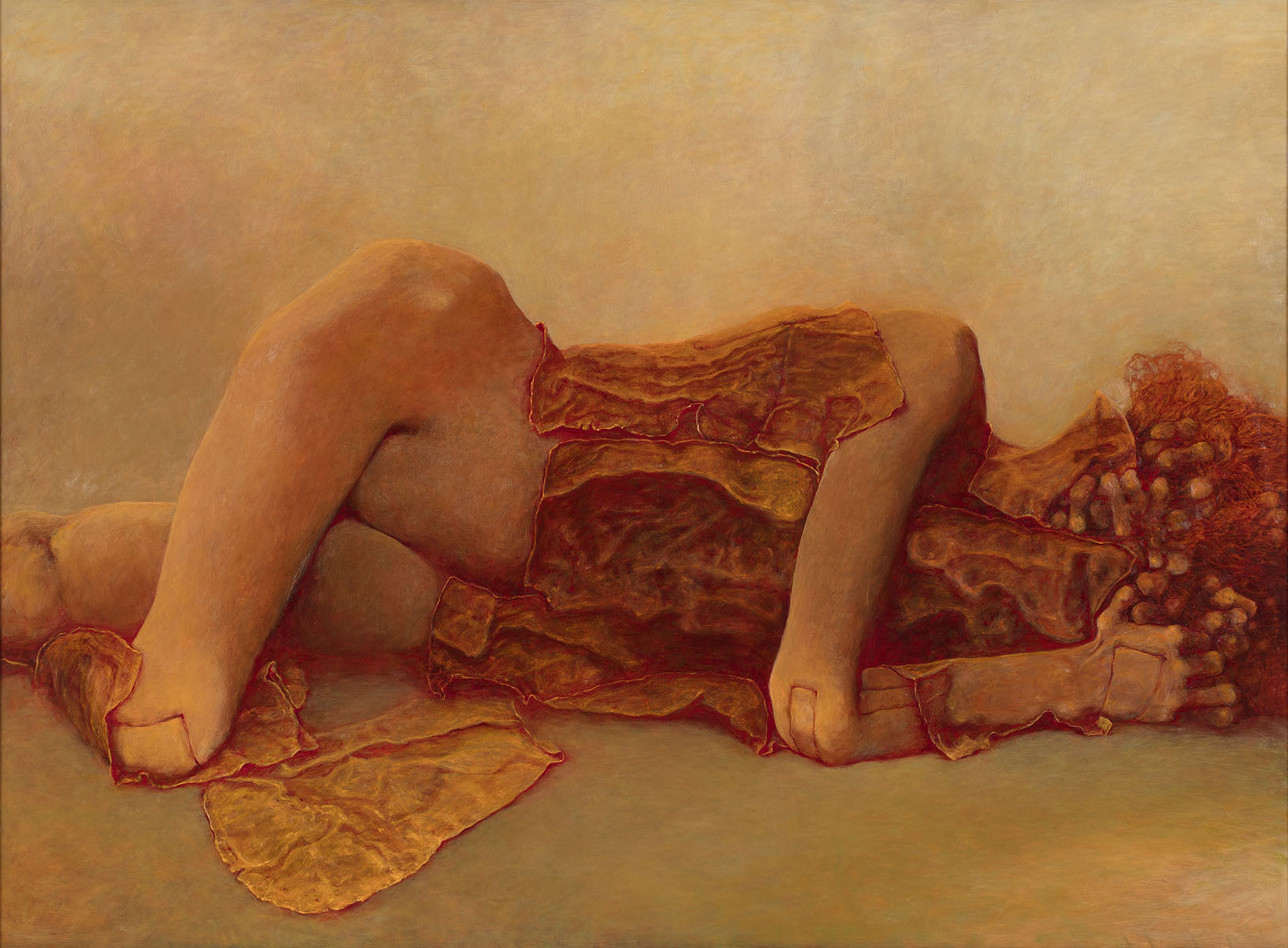 Podobnie przejmującą atmosferę oddaje kompozycja „QŚ” z 1999 roku. Porzucona, zdeformowana postać leży w niedookreślonej przestrzeni, jakby poza czasem i światem. Jej ciało, organiczne, ulegające rozkładowi, trwa w bezruchu, na zawsze zatrzymane w stanie destrukcji. Ręka uniesiona ku miejscu, gdzie powinna znajdować się twarz, potęguje wrażenie pustki, rozpaczy i niemożności komunikacji. Nie ma tu narracji, anegdoty ani symbolu – liczy się przede wszystkim wrażenie.