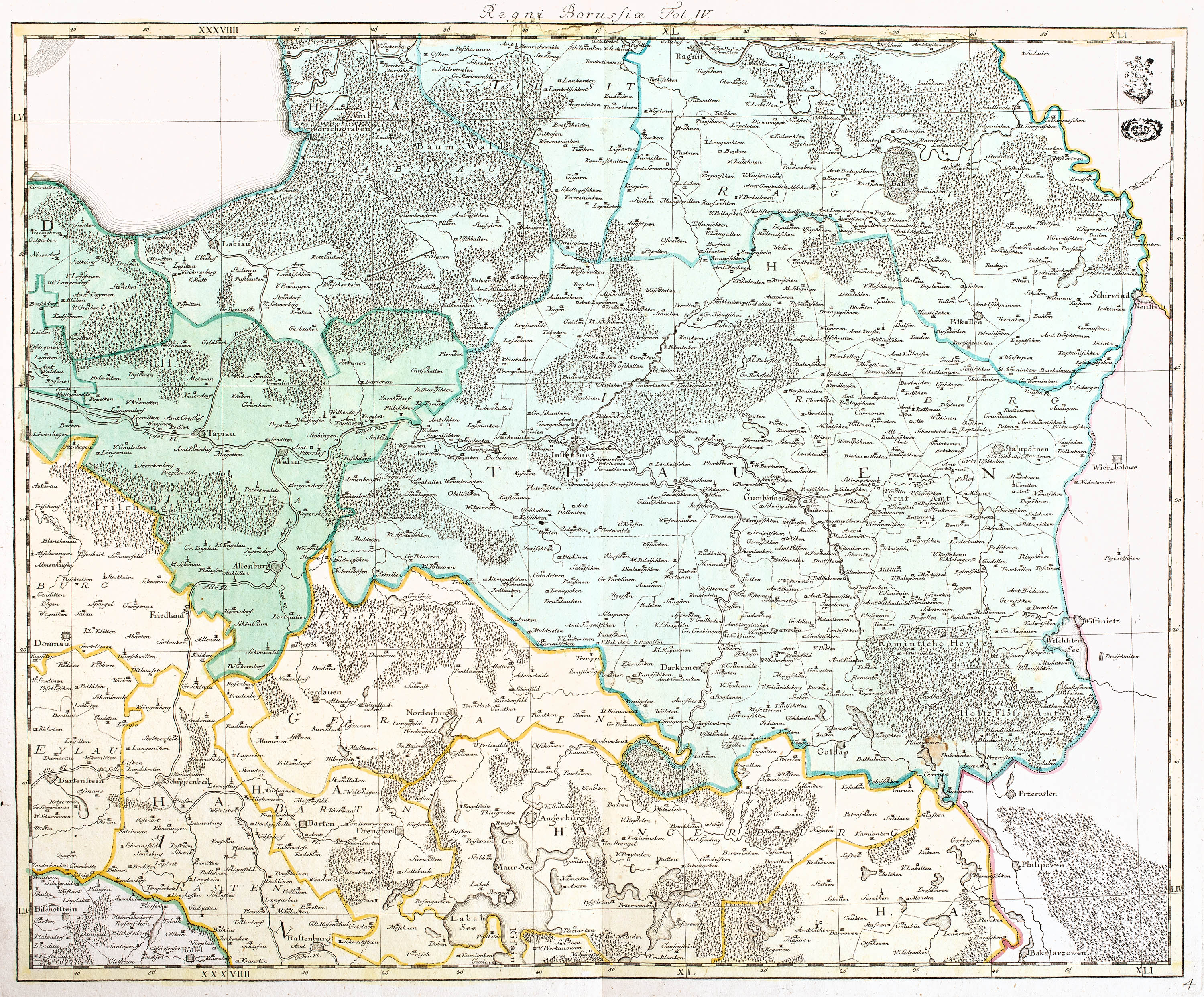 Mapa części Królestwa Prus, fragment sześcioczęściowej mapy „Regnum Borussiae Episcopatus…”, wyd. A. A. Rhode, 1763