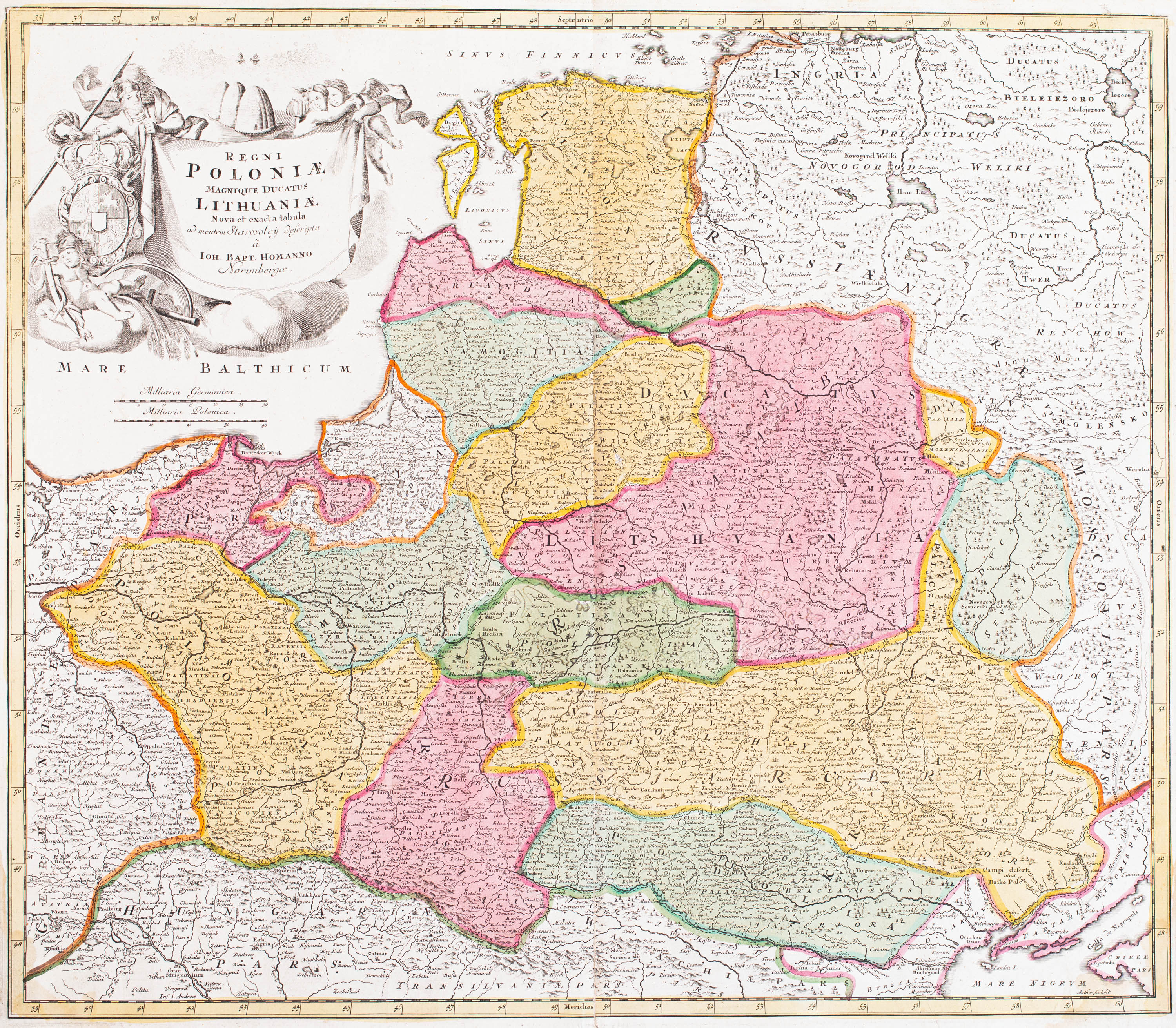 Mapa ziem Rzeczpospolitej, stan między trzecim a szóstym, Norymberga, 1707-1710 miedzioryt kolorowany w epoce, 49,3 x 57,3 cm (odcisk płyty) stan zachowania: ślady zacieków w dolnych narożnikach rzadkie Imago Poloniae, K16