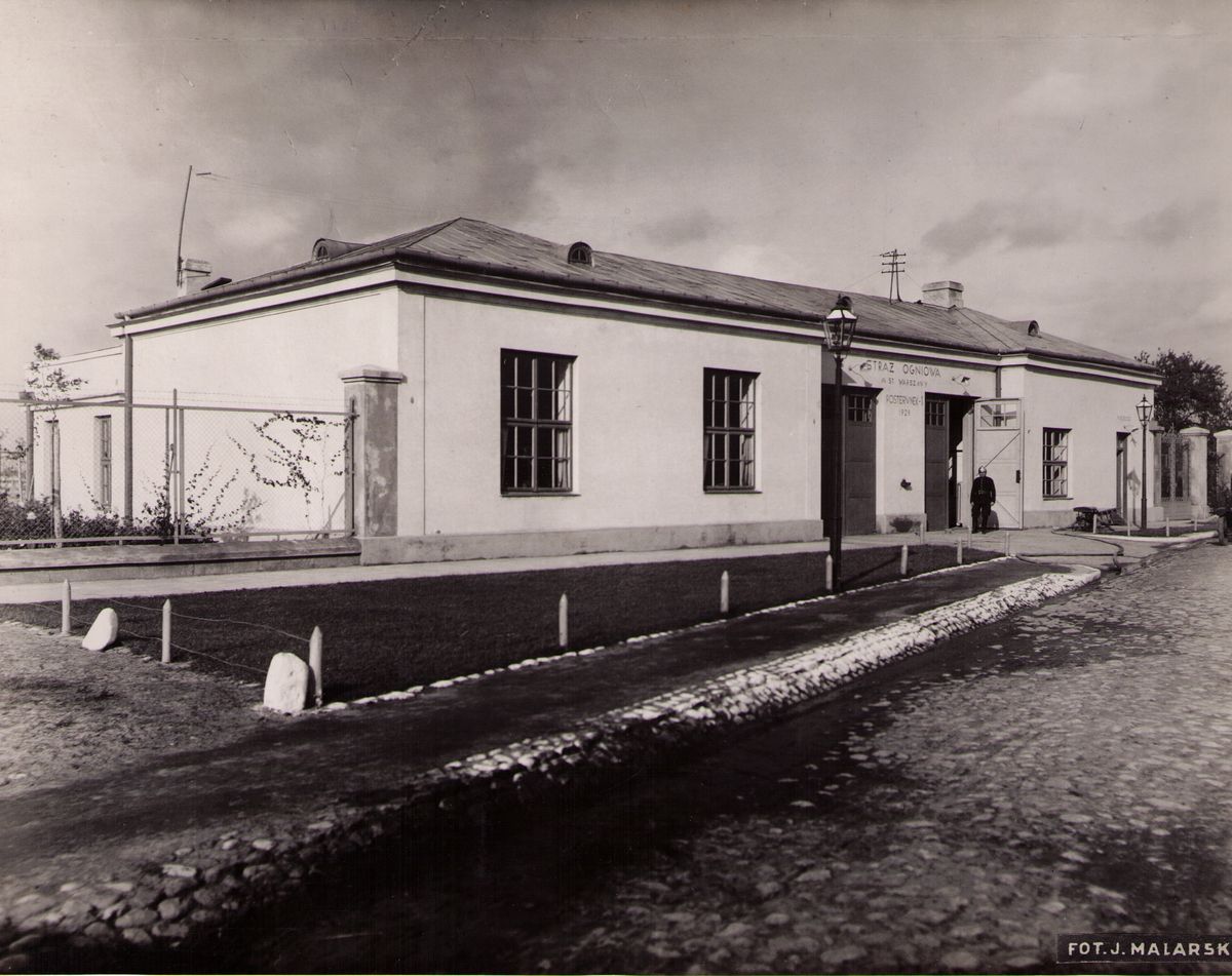 Na odwrocie stempel:Agencja Fotograficzno-Prasowa / Jan Malarski / Chmielna 10, tel. 224-20 / Prawo reprodukcji zastrzeżone; maszynopis: Budynek Posterunku Straży Ogniowej przy ul. Toruńskiej na Bródnie. Dnia 13.1930 roku