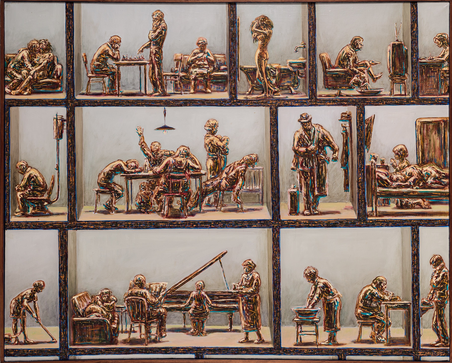 olej/płótno105 x 130 cmsygnowany p.d.: "Z. MIL'95 r" oraz opisany na odwrocie: "Równoczesność odmiennych codzienności" 1995 r. Z. Mil"