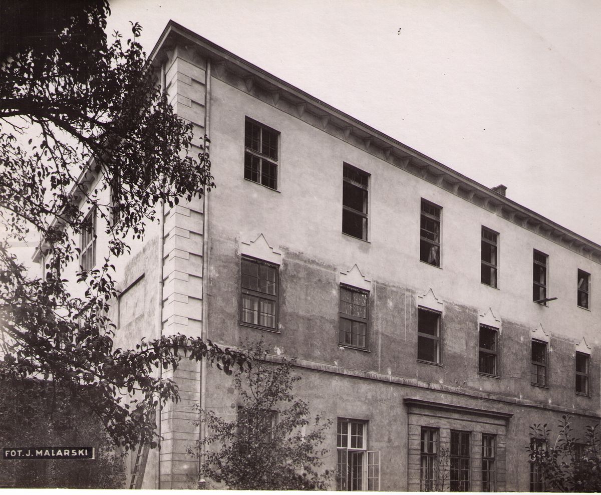 Na odwrocie stempel:Agencja Fotograficzno-Prasowa / Jan Malarski / Chmielna 10, tel. 224-20 / Prawo reprodukcji zastrzeżone; piórem: nadbudowa 1go piętra nad centralnym budynkiem na salę wykładową w szp. Śgo Ducha