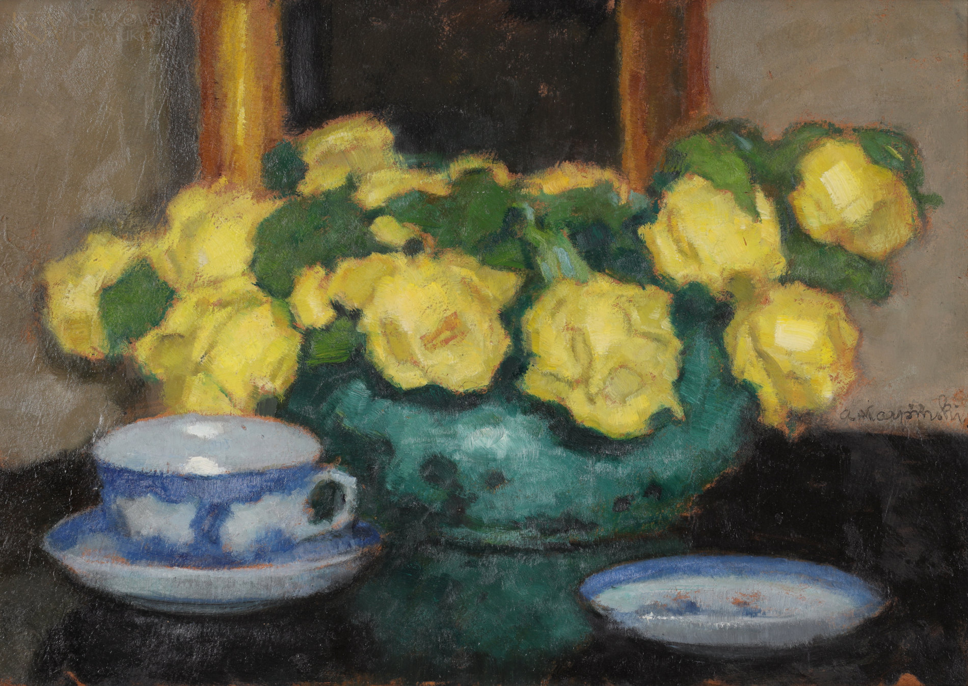 olej, tektura34,5 x 49 cm; 49,5 x 64 cm (z oprawą)Sygn. p.śr.: "a. Karpiński."Opisany na odwrocie: "Róże żółte | mal. a. Karpiński | Kraków [nieczytelne]"
