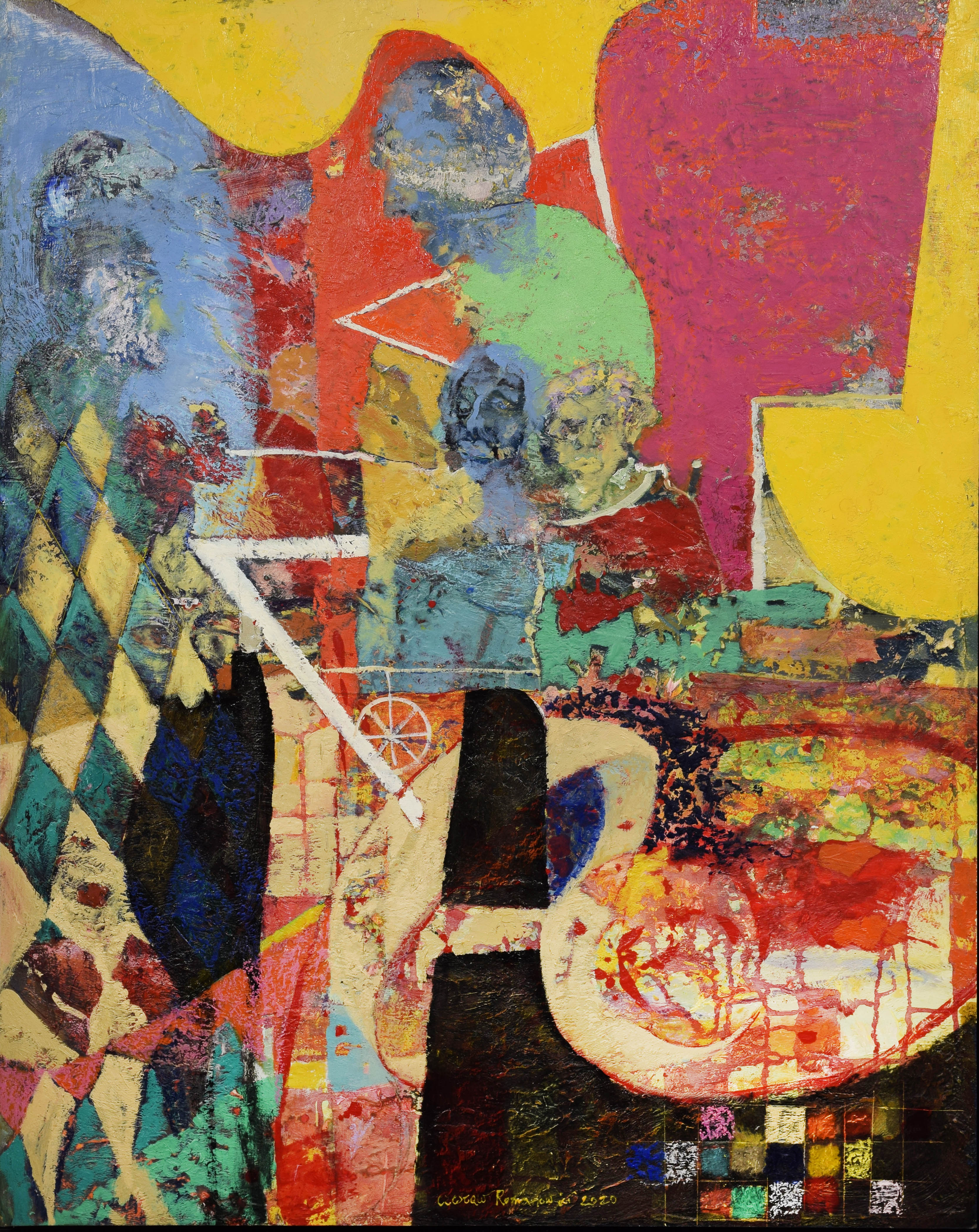 olej, płyta; 100 x 80 cm; sygn. i dat. pośrodku u dołu: Czesław Romanowski 2020; na odwrocie opis autorski: "Rozmowa" CZESŁAW / ROMANOWSKI / OLEJ NA PŁÓTNIE/PŁYTA / 2020 R. / 100 x 80 cm oraz drukowana nalepka.