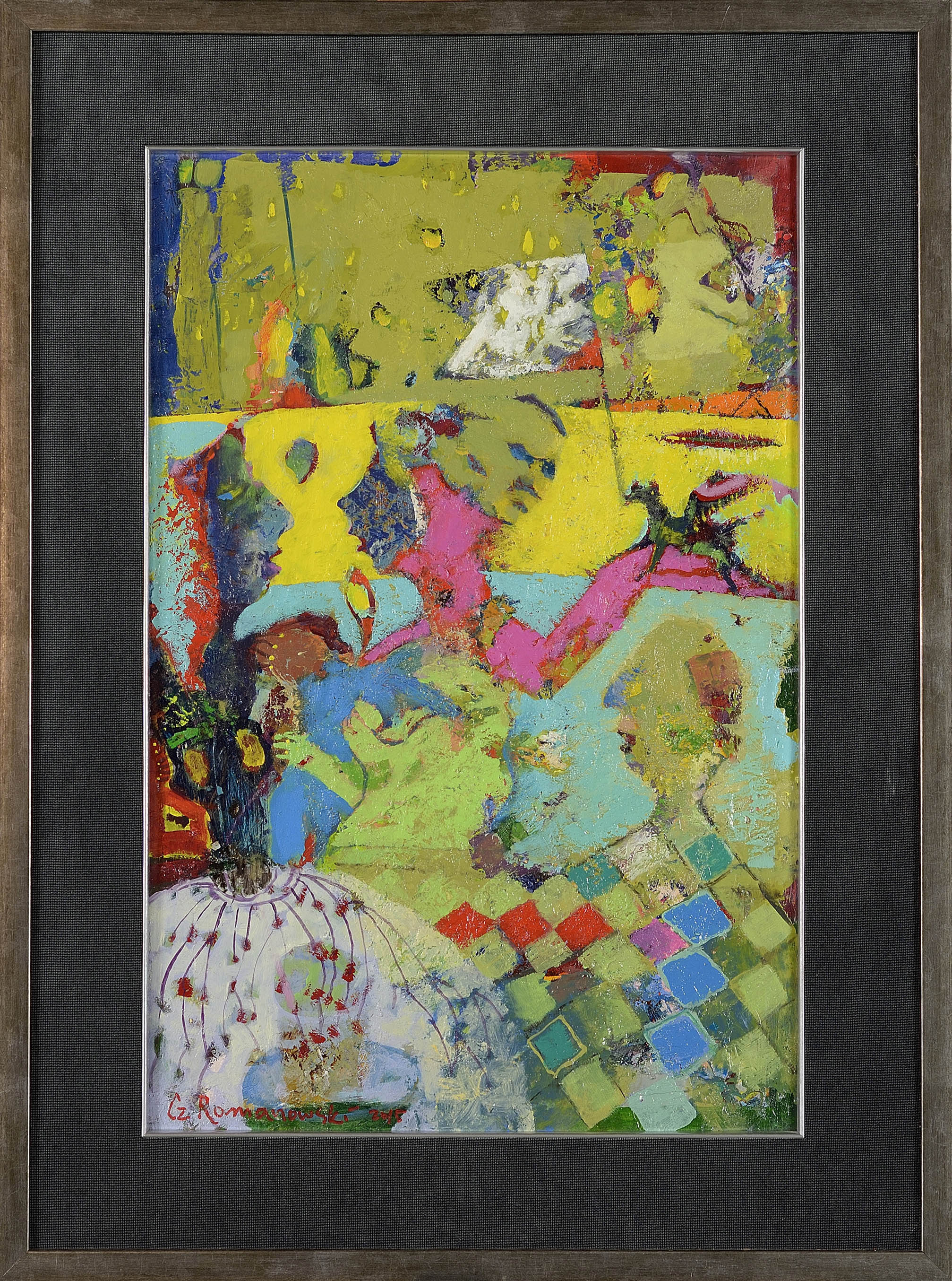 Praca opisana na odwrocie: "Czesław Romanowski "Rozmowa" l.d. DISCUTION 60 x 40 cm, olej na płycie".