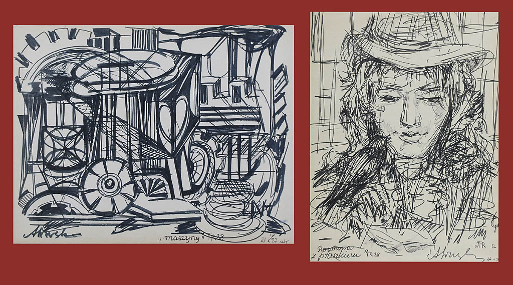 Praca dwustronna; Rozmowa z ptaszkiem: tusz, papier, 27 x 21 cm; sygn. p. d.: AWnęk; tytuł l. d.: Rozmowa / "z ptaszkiem" TR 28; Maszyny: tusz, papier, 21 x 27 cm; sygn. l. d.: AWnęk; tytuł. p. d.: "maszyny" TR 28
