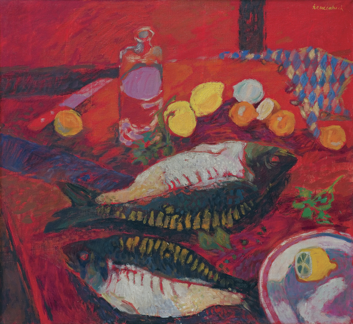 olej, płótno79,8 x 86 cmsygn. p.g.: Szancenbachna odwrocie centralnie umieszczony napis: JAN SZANCENBACH | RYBY | 1975