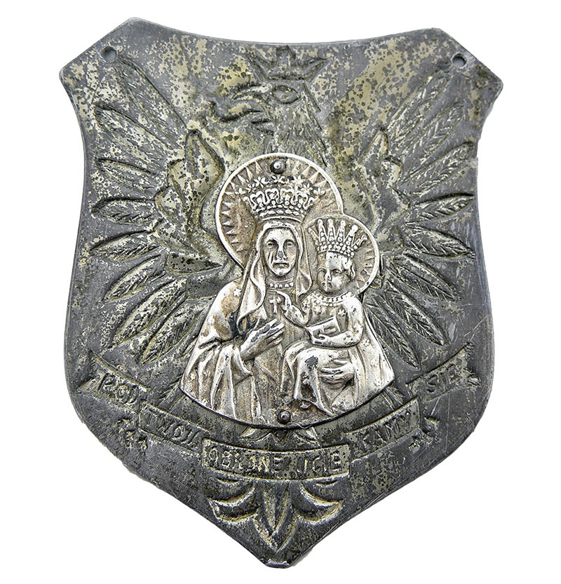 Ryngraf patriotyczny w kształcie tarczy herbowej z przedstawieniem orła. Do tarczy przytwierdzony wizerunek Marki Boskiej z Dzieciątkiem.