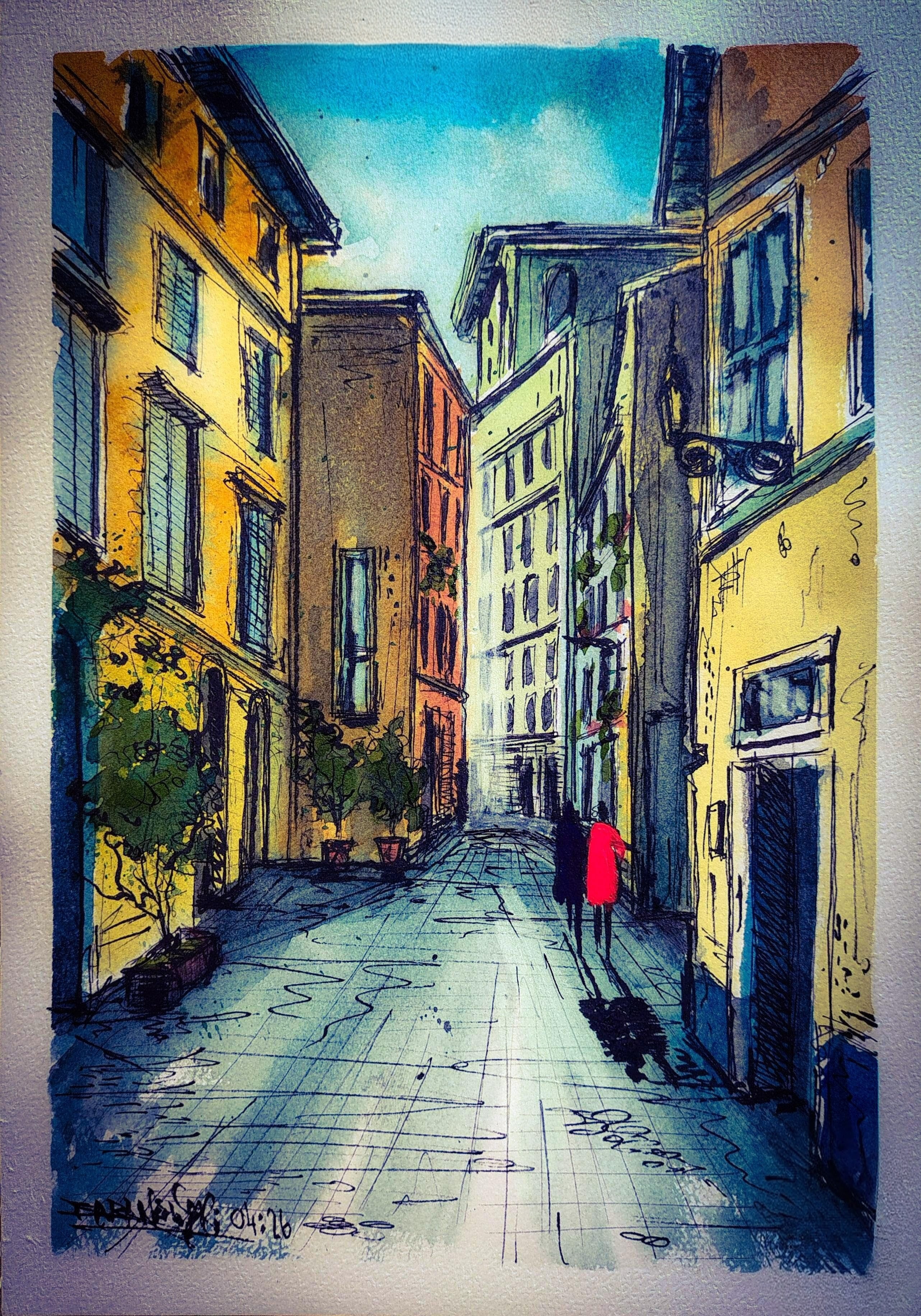 technika mieszana (akryl, cienkopis, akwarela), papier 300 g, 29,7 x 21 cm, w oprawie: 31,5 x 23 cm,