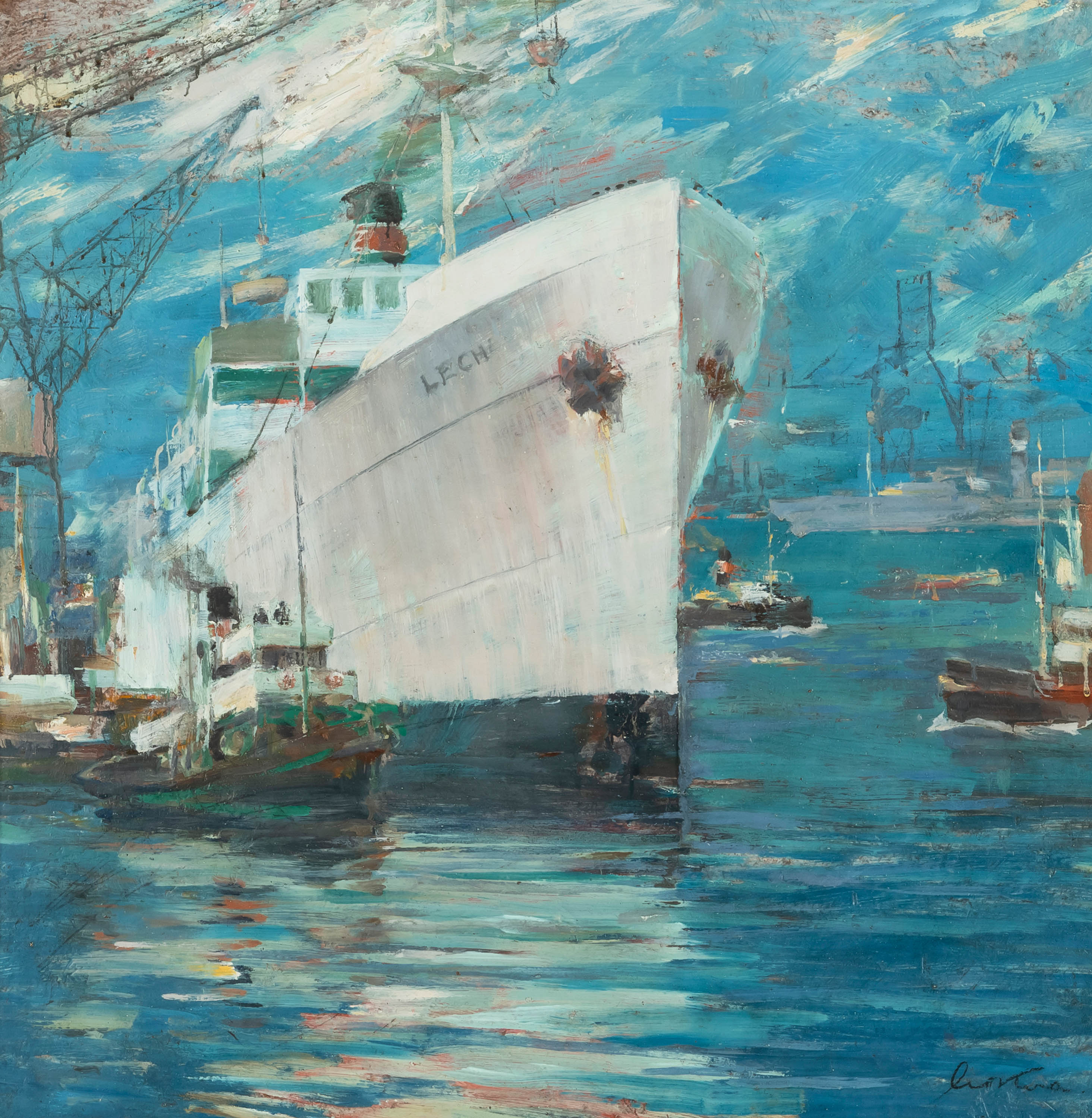 Tytułowy „S/s „Lech”, który Marian Mokwa uchwycił na swoim obrazie został zbudowany w 1934 roku na zamówienie Polbryt do obsługi linii angielskiej, przez brytyjską stocznię Swan Hunter & Wigham Richardson w Newcastle on Tyne. W czasie II wojny światowej operował na Morzu Śródziemnym jako jednostka zaopatrująca Maltę. Po zakończeniu wojny wrócił na trasę Gdynia–Londyn. 1 października 1948 roku zatonął na Bałtyku w pobliżu Gedser po wejściu na minę magnetyczną; w zdarzeniu nie było ofiar. W 1949 roku został wydobyty przez PRO i wyremontowany w duńskiej stoczni w Nakskov, a w czerwcu 1950 roku ponownie wszedł do eksploatacji. Od 1951 roku, już w barwach PLO, nadal obsługiwał linię angielską, natomiast od 1960 roku kursował na trasie Gdynia–Szczecin–Brema–Hamburg. W 1962 roku przekazano go do CBKO, gdzie pełnił funkcję statku-laboratorium. W 1967 roku jednostkę zezłomowano. „S/s „Lech” stanowi centralny punkt kompozycji. Potężna, jasna bryła kadłuba kontrastuje z głębokim błękitem wody. Dzieło posiada wybitne walory artystyczne, a ujęty motyw dodaje mu wartości niemalże historycznej. Mokwa niczym kronikarz dokumentuje wizerunek statku, który zniknął z morskich wód. Prezentowany obraz powstał około 1949 roku, czyli w uznawanym przez badaczy jednym z najznakomitszych czasów w twórczości Mokwy „Patrząc na dorobek artysty z lat 1945–1965, trzeba stwierdzić, że był to – obok lat trzydziestych – w jego twórczości okres najlepszy.” (Wojciech Zmorzyński Marian Mokwa. Malarstwo”, Gdańsk 2003, s. 25) Dzieło pod tytułem „S/s „Lech” może być idealny potwierdzeniem przytoczonych słów.