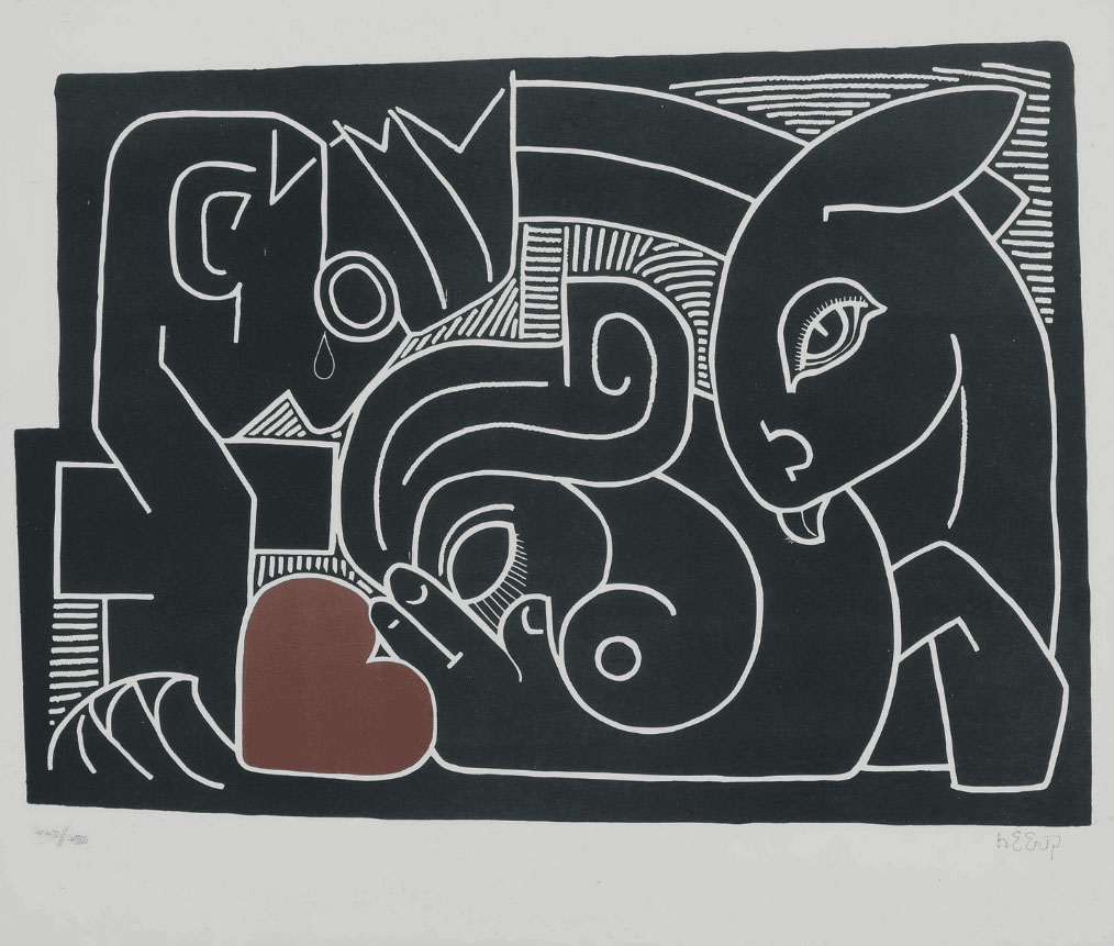 Kompozycja opiera się na mocnych, konturowych liniach i uproszczonych, niemal bajkowych formach, ukazujących postaci ludzkie, zwierzęce oraz serce jako symbol emocji. Mimo pozornej naiwności formy, dzieło niesie w sobie głęboki ładunek emocjonalny – mówi o miłości, izolacji i potrzebie bliskości.