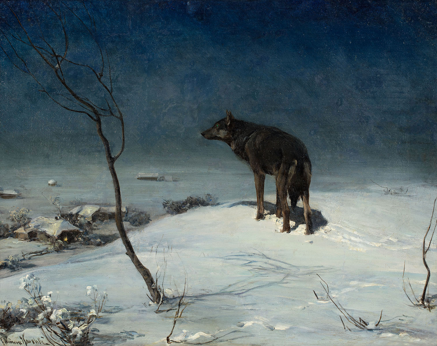 Prezentowany obraz ukazuje nocny pejzaż z samotnym wilkiem, stojącym na ośnieżonym wzniesieniu, poniżej którego rozciągają się zabudowania wiejskie. Scena utrzymana jest w chłodnej tonacji bieli, błękitów i szarości, a jej cisza i napięcie oddają mistrzowską zdolność Wierusza do budowania atmosfery – jednocześnie realistycznej i symbolicznej. W takich kompozycjach szczególnie wyraźnie ujawnia się jego credo malarskie: „Od natury bierz wszystko na każdy raz. Postrzegaj i notuj każdy ruch, każdy kształt, choćby moment trwający…” (J. Puciata-Pawłowska, Dzieje Miejskiej Szkoły Sztuk Zdobniczych i Malarstwa w Warszawie, 1939–1940, s. 31).