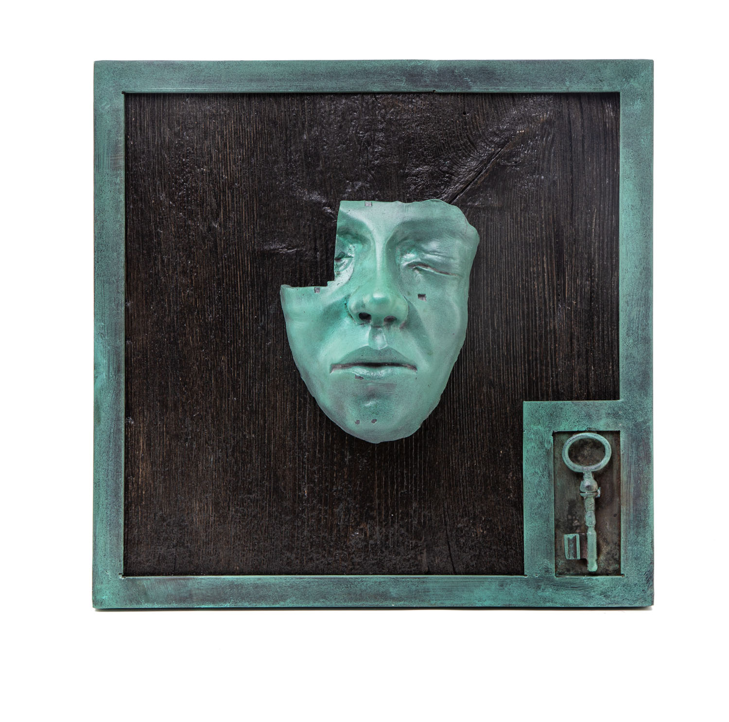 brąz patynowany, drewno, 35 x 35 x 9 cm