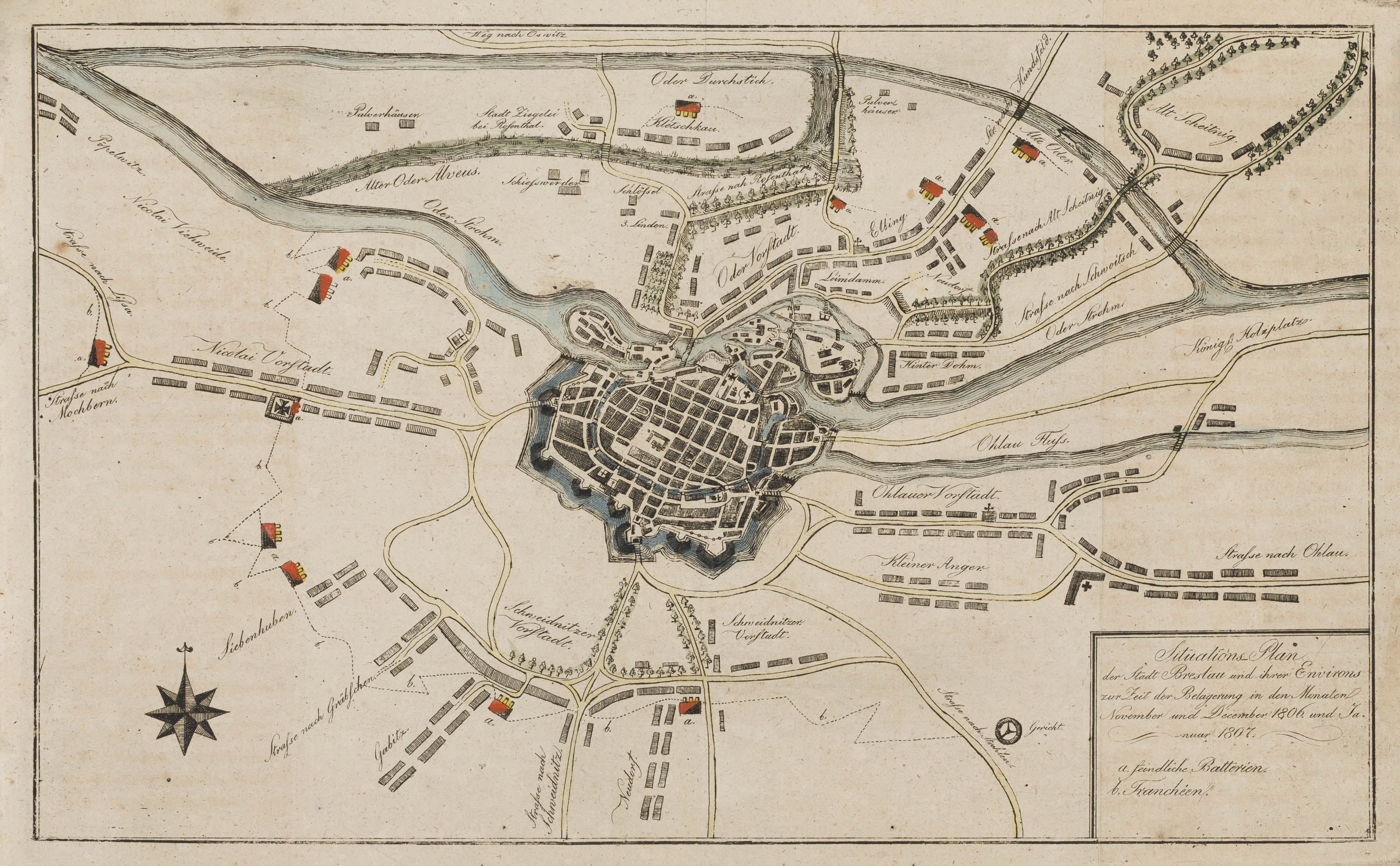Plan fortyfikacji Wrocławia podczas oblężenia przez wojska napoleońskie w l. 1806-1807, wyd. 1808 miedzioryt kolorowany w epoce, wym. mapy 20,8 x 34 cm