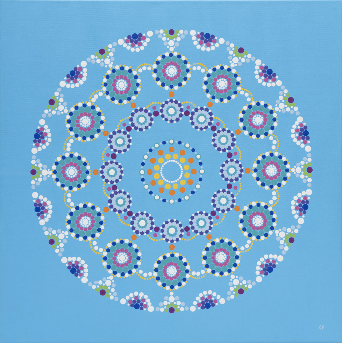 akryl, płótno, 70x70 cm,sygn. p.d.: EF,opisany na odwrocie: Emilia Aleksandra Formella "Słoneczne niebo" 2021 akryl 70x70
