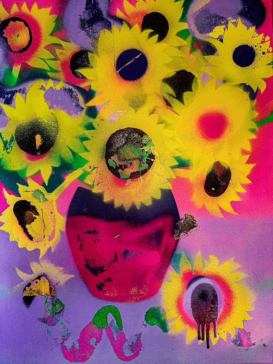 technika mieszana (farby w spreju montana black, montana metallic efekt, akryl, szablony), płótno, 50 x 40 cm,