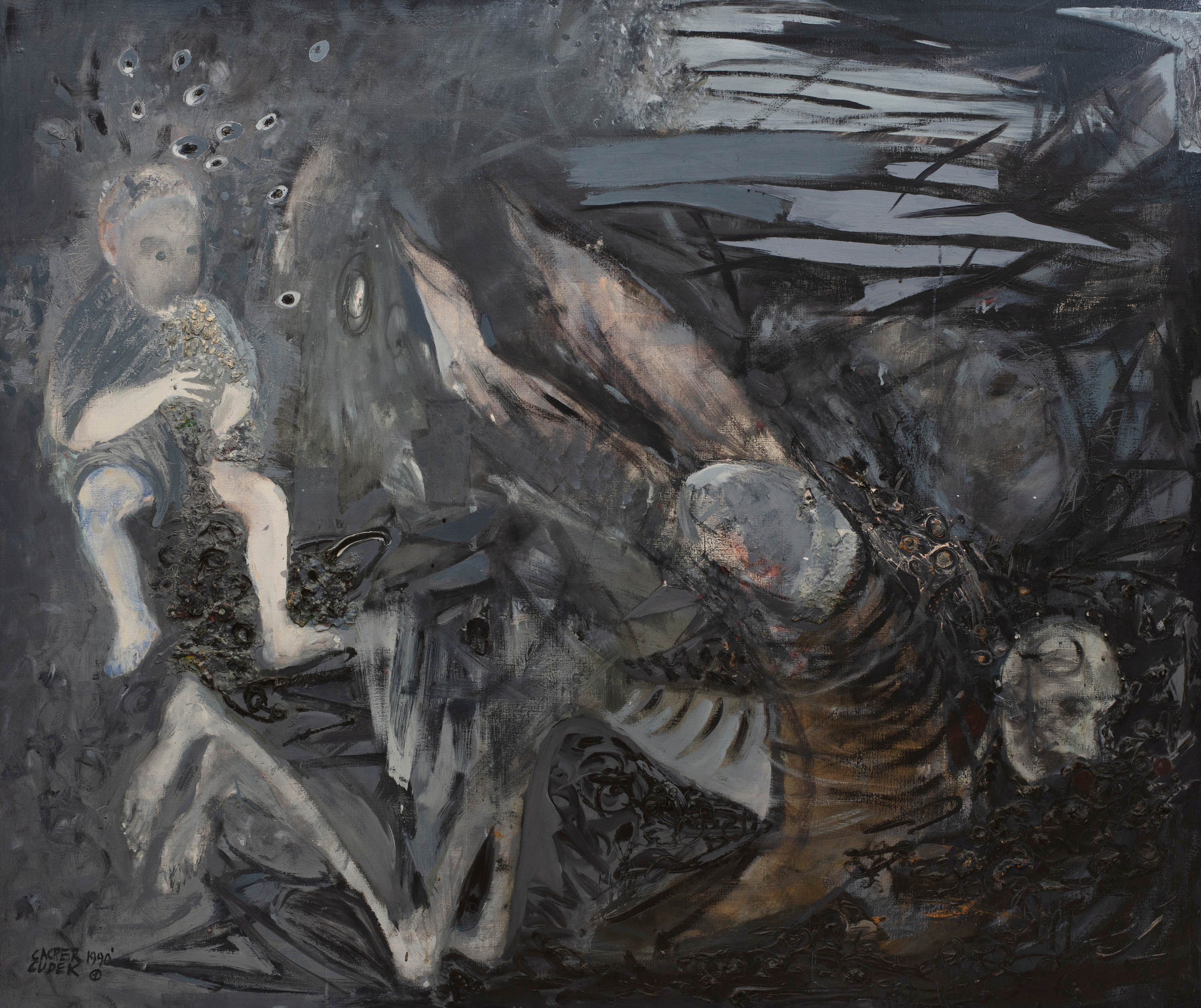 sygnowany l.d.: 'CACPER 1990 | CUDEK (1)' oraz opisany na odwrocie: 'CACPER CUDEK 1990 (1) ↑ | "ŚMIERĆ JEST ZŁA, BO GDYBY BYŁO | INACZEJ BOGOWIE WYBRALIBY DLA SIEBIE | ŻYCIE ŚMIERTELNE" SAFONA'